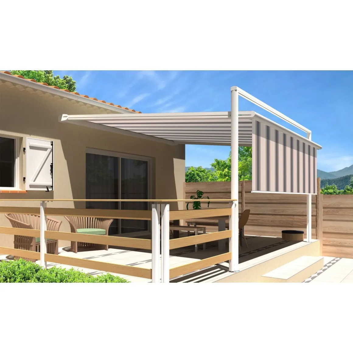 La pergola toile MELODIE est un compromis entre un store et une pergola rigide. La toile est guidée ce qui lui procure une ouverture comme un store. Rapide à déployer et résistante au vent grâce à sa structure en aluminium laquée blanc, cette pergola store MELODIE a tout pour plaire ! Cette pergola MELODIE est également composée d’un lambrequin droit assorti à la toile de la pergola, pour vous apporter encore plus d’ombre si vous le souhaitez. Motorisé avec télécommande et manœuvre de secours, cette pergola store MELODIE 3x3x1.5m de fabrication française trouvera sa place sur votre terrasse.