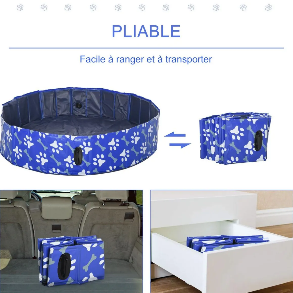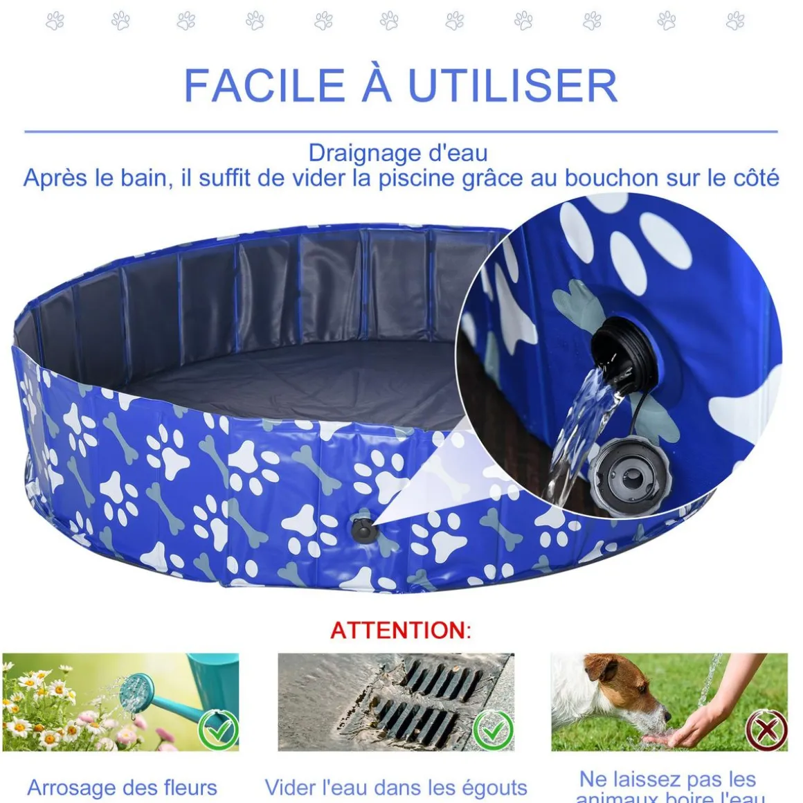 – Piscine chien très pratique car elle ne nécessite pas de pompe à air, de gonflage épuisant et que sa fonction pliable vous permettra de la ranger en toute commodité