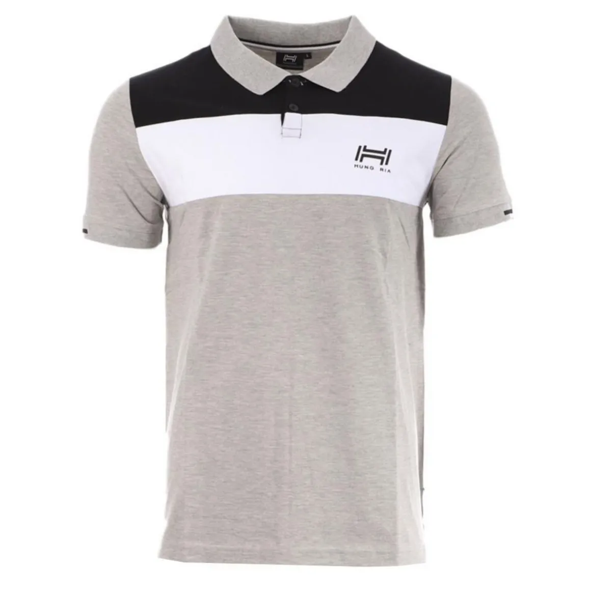 Polo homme de la marque Hungaria ! Couleurs : Noir/Gris/Blanc Coupe altique Col boutonné Manches courtes Logo Hungaria thermocollé Composition : 48% coton, 47% polyester, 5% élasthanne