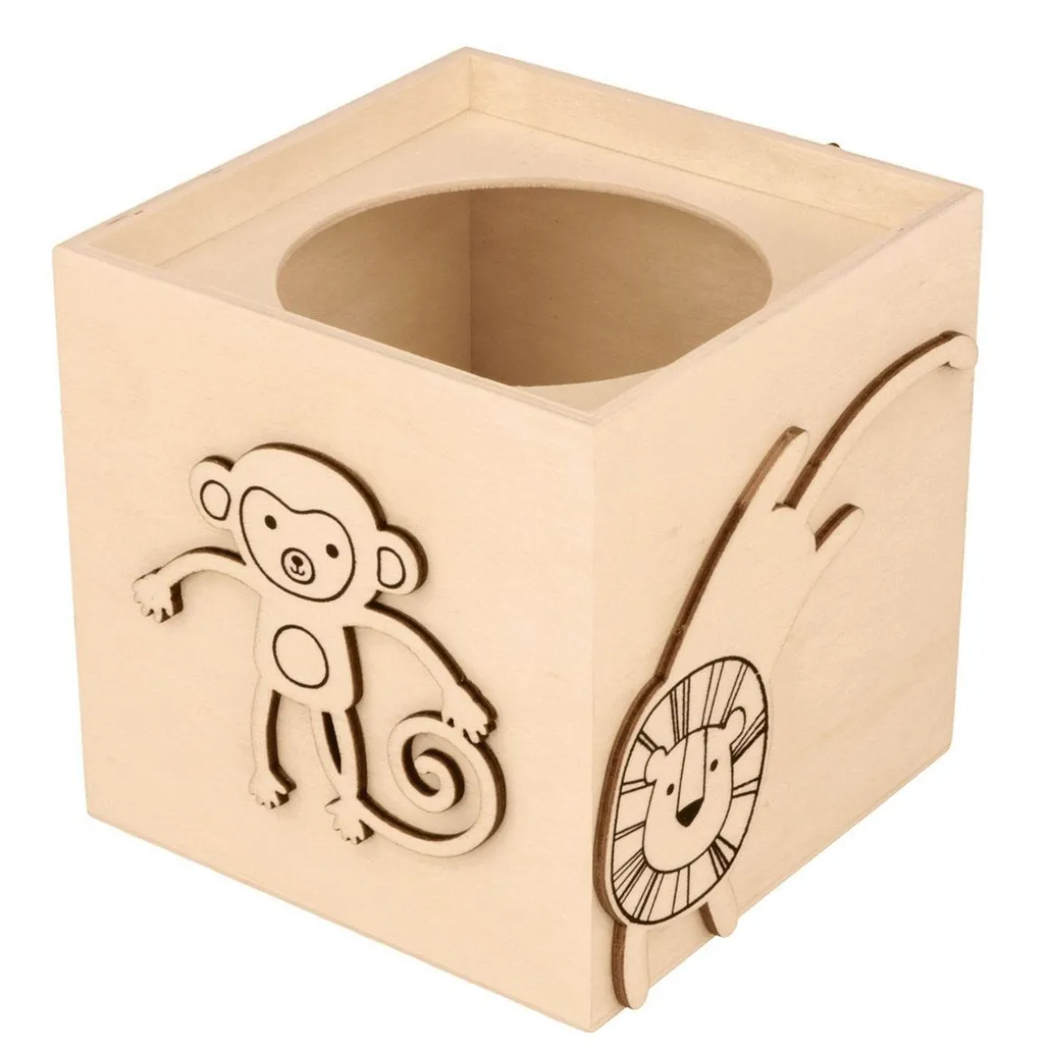 Adorable pot à crayons en bois carré sur le thème des animaux de la savane. Il est décoré sur ses 4 faces de silhouettes d’animaux ( zèbre, lion, hippopotame, singe ). Vous pouvez le laisser de sa couleur naturelle ( bois ) ou le customiser à l’aide de peinture ou de stickers par exemple. Idéal pour décorer et ranger un bureau d’enfant. Dimensions du produit : 10 x 10 x 10 cm.
