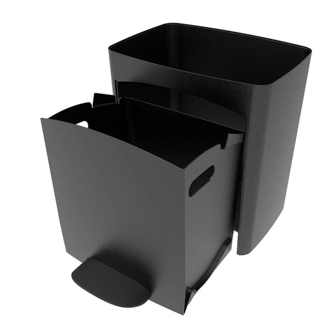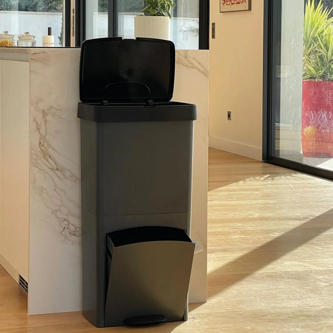 - FABRIQUE EN EUROPE. En plastique recyclé. Capacité 70L Couleur noir gris anthracite. Dimensions : env. 39 x 29 x 76.5 cm (l x P x H). Compact et facilement intégrable. Avec un encombrement de seulement 39 x 29 cm et une capacité de 70 litres – sur 2 ou 3 compartiments, cette station de tri remplace 3 poubelles n’encombre pas votre cuisine. Poids : 3.5kg légère et facile à déplacer.