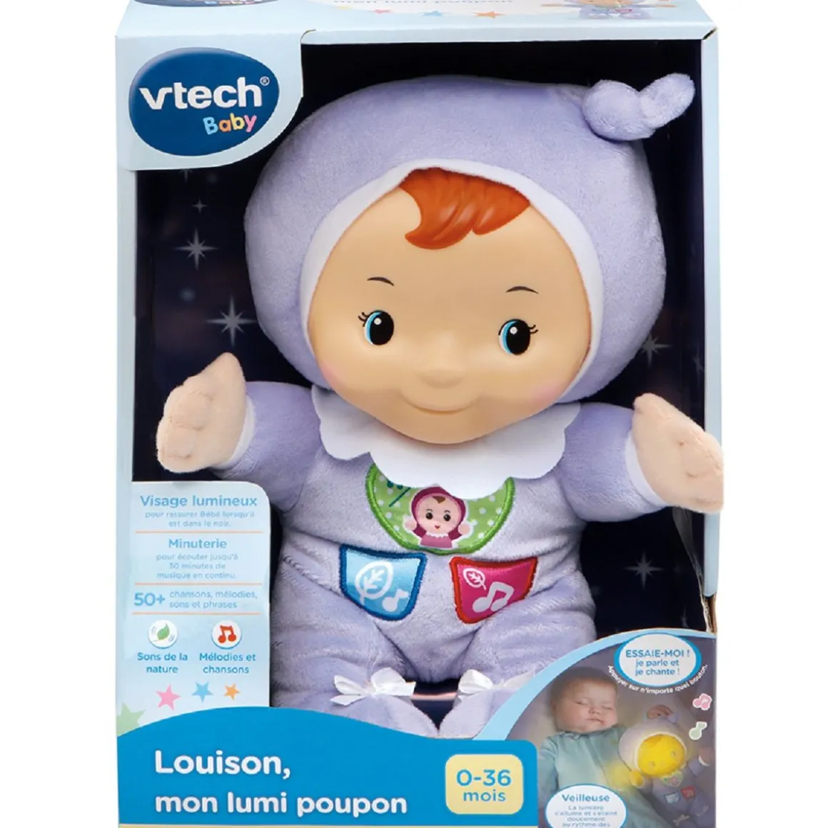 Louison la poupée interactive est le compagnon idéal, il parle, s’illumine et émet de la musique. Son visage lumineux rassure bébé et lui permet de ne plus avoir peur la nuit. Génial ! Le gros bouton en forme de cœur sur son ventre permet de déclencher des phrases apaisantes et de douces mélodies. 2 chansons et 40 mélodies incluses qui sauront divertir bébé