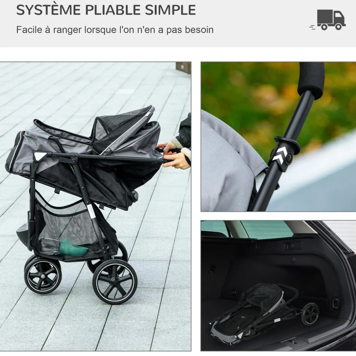 – Panier inférieur et sac de rangement à l’arrière pour un accès facile aux fournitures pour animaux et aux effets personnels