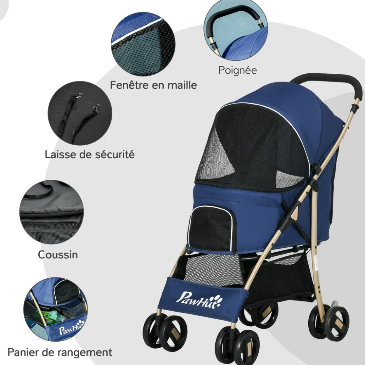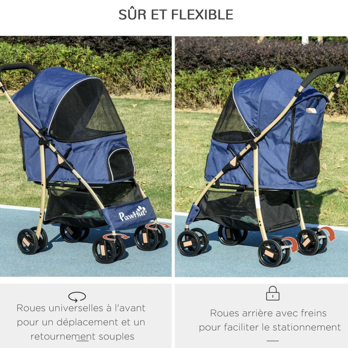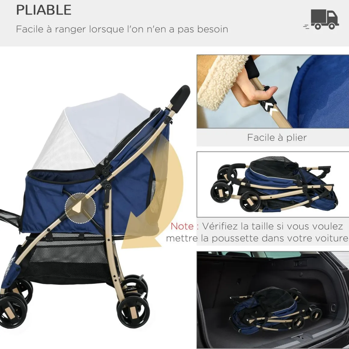 – Poussette pour chien pliable avec panier inférieur et sac zippé pour le rangement
