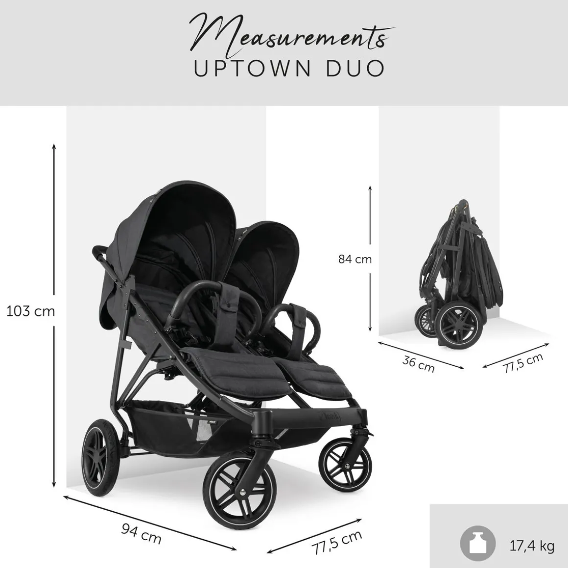 La poussette Uptown Duo de Hauck est la solution idéale pour les familles avec des jumeaux ou des enfants d’âge rapproché, alliant confort, praticité et sécurité. Compacte avec une largeur de seulement 77 cm, elle passe facilement à travers les portes tout en offrant un grand confort grâce à ses sièges réglables individuellement en position allongée, ses roues tout-terrain et sa suspension qui assurent une conduite fluide sur tous les types de sols. Les capotes extra-larges avec protection UPF 50+ et fenêtres de ventilation permettent à vos enfants de voyager à l’abri du soleil tout en restant bien aérés. Pour une sécurité maximale, l’Uptown Duo est équipée de harnais 5 points, de barres de protection antichute et d’un frein de blocage. Le grand panier et le porte-gobelet ajoutent une touche de praticité pour vos courses et boissons. De plus, elle peut être utilisée dès la naissance en combinaison avec les nacelles souples 2en1 Carrycot, transformables en couvre-jambes.
