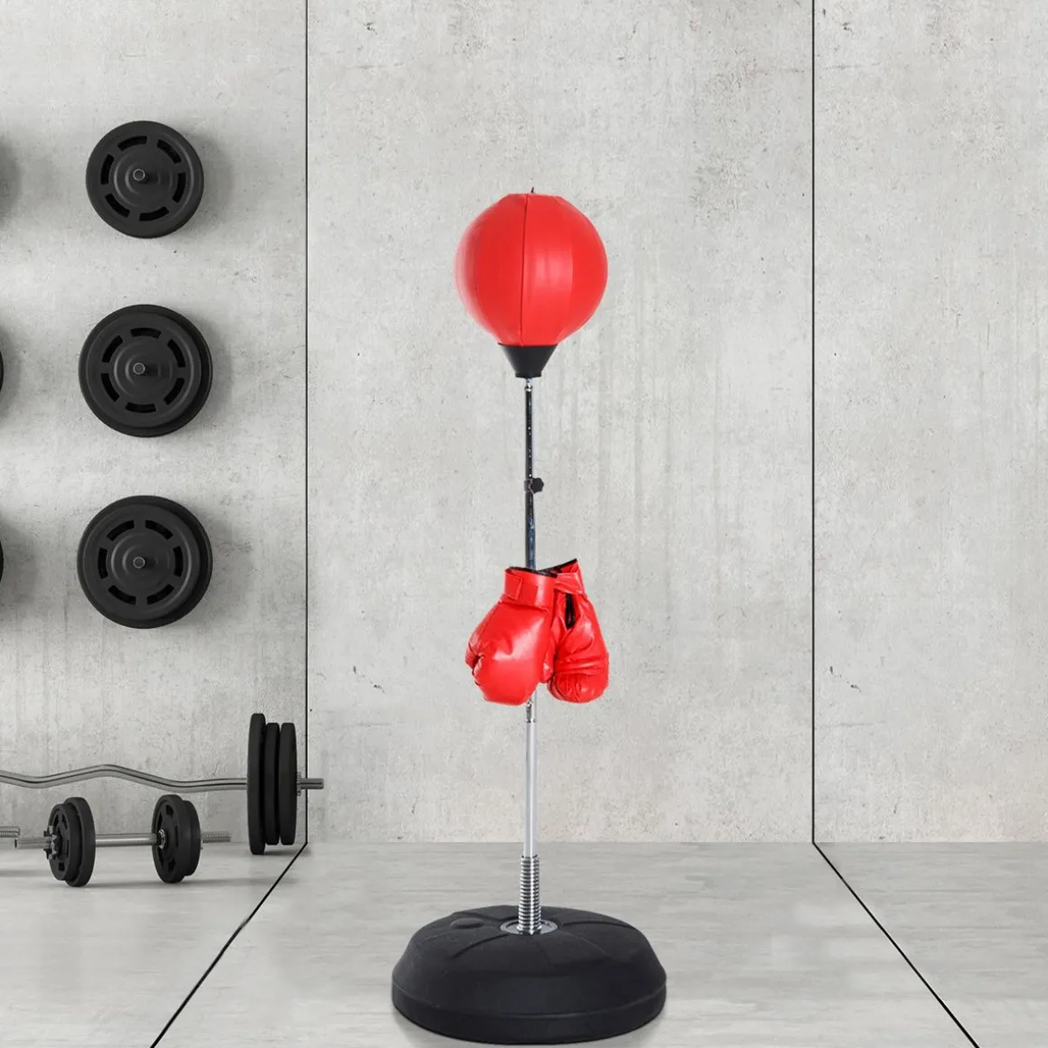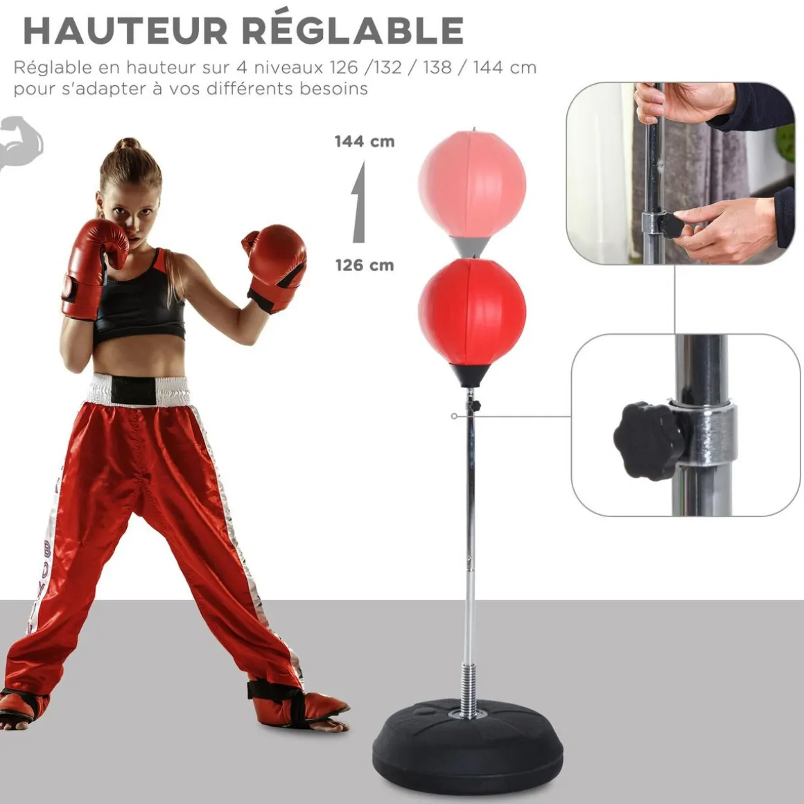 Ce punching ball sur pied réglable en hauteur de 126 jusqu’à 144 cm vous permettra de pratiquer un entrainement varié et soutenu pour divers sports de combat : boxe anglaise, française, thaï, free fight, taekwondo, etc… C’est l’équipement indispensable pour développer votre palette de coup, votre endurance et ainsi devenir champion !