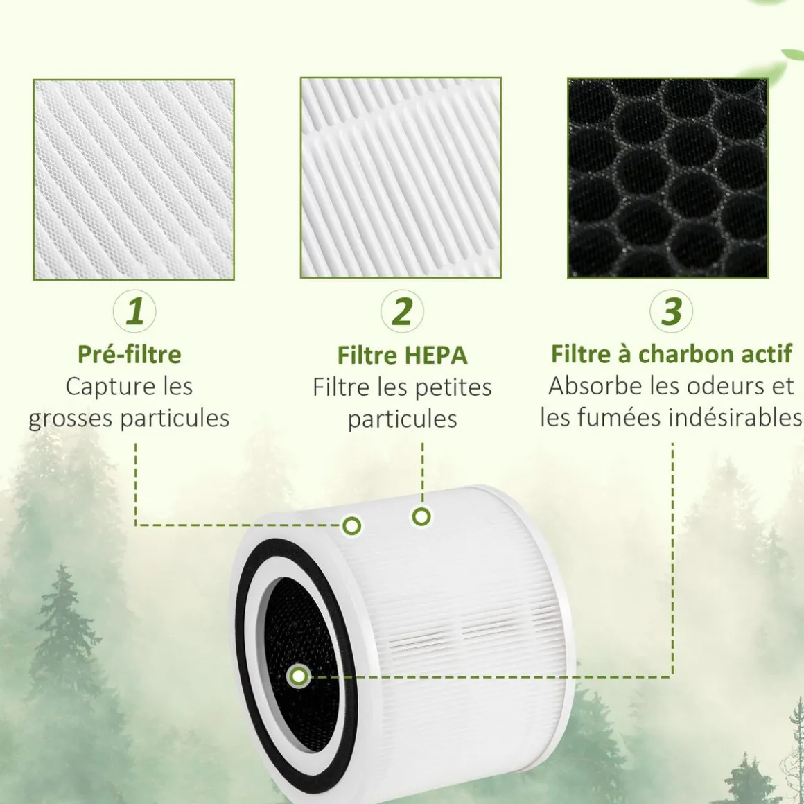 – Triple niveau de filtre : pré-filtre, HEPA, charbon actif