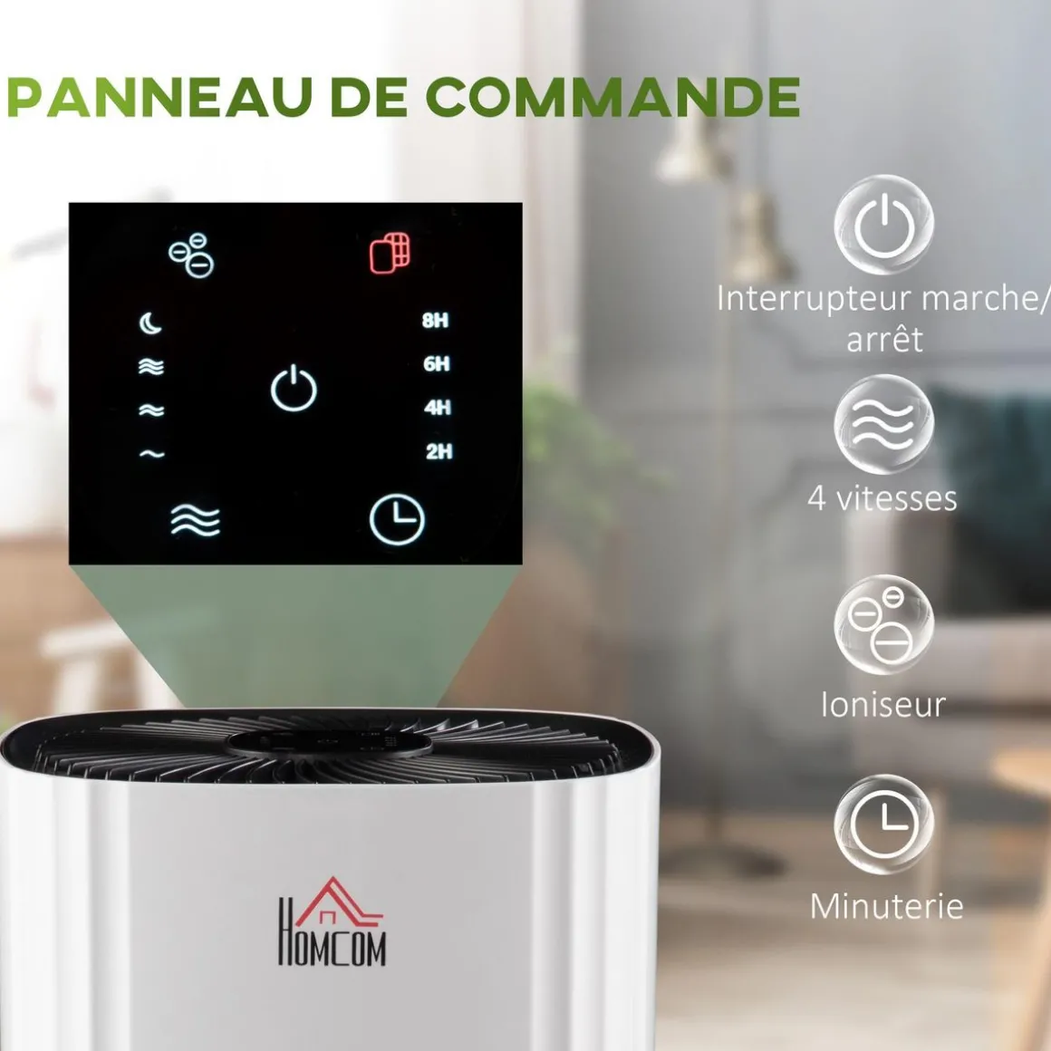 – Panneau de contrôle tactile pour gérer tous les modes/fonctions (reset, timer jusqu’à 8 h, veille, ioniseur, vitesse, marche/arrêt)