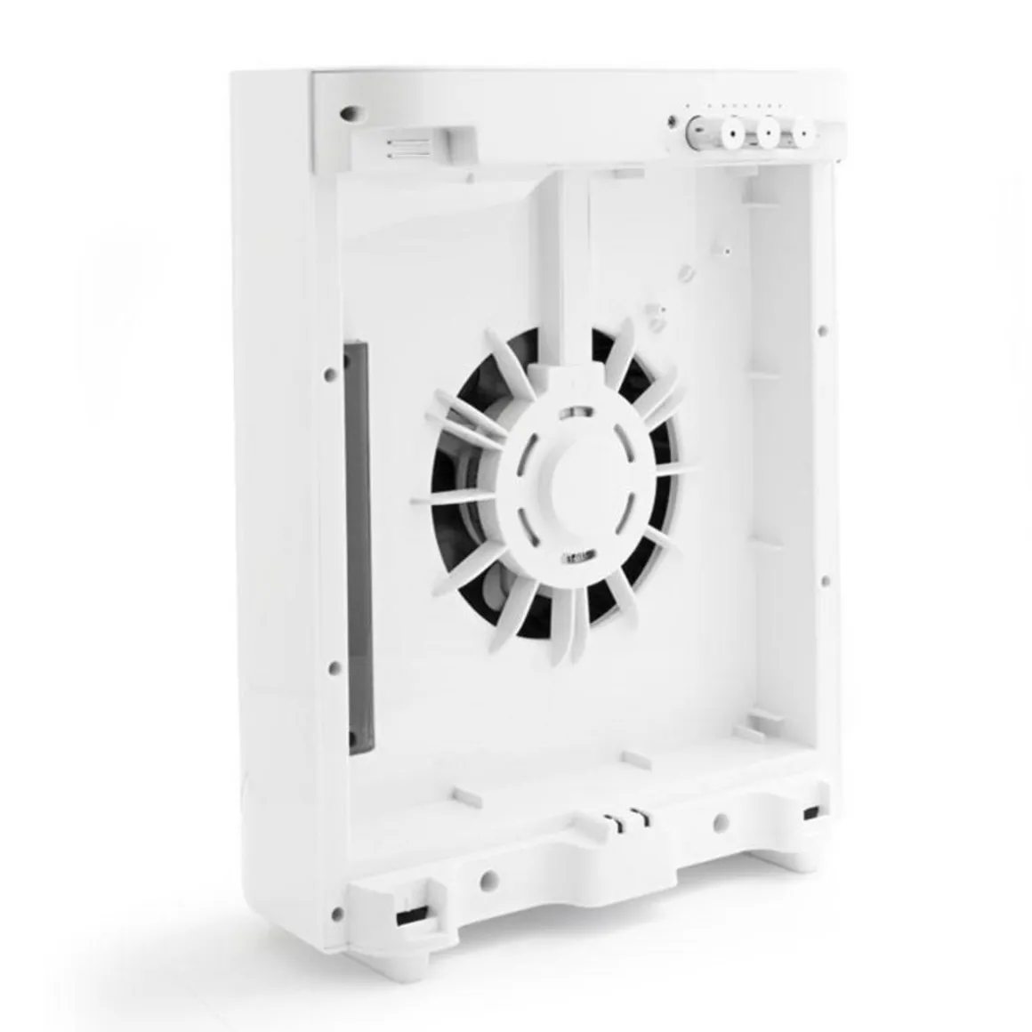 Les commandes s’effectuent à travers un panneau de commande tactile ultra simple à 3 touches. De petites LEDs bleu indiquent ce faisant quel est le réglage en cours et si il est temps de changer le filtre. Trois niveaux de puissance vous permettent de régler l’appareil au degré d’impureté de l’air. La minuterie vous permet également de l’activer pendant 2, 4 ou 8 heures avant qu’il ne s’éteigne automatiquement.