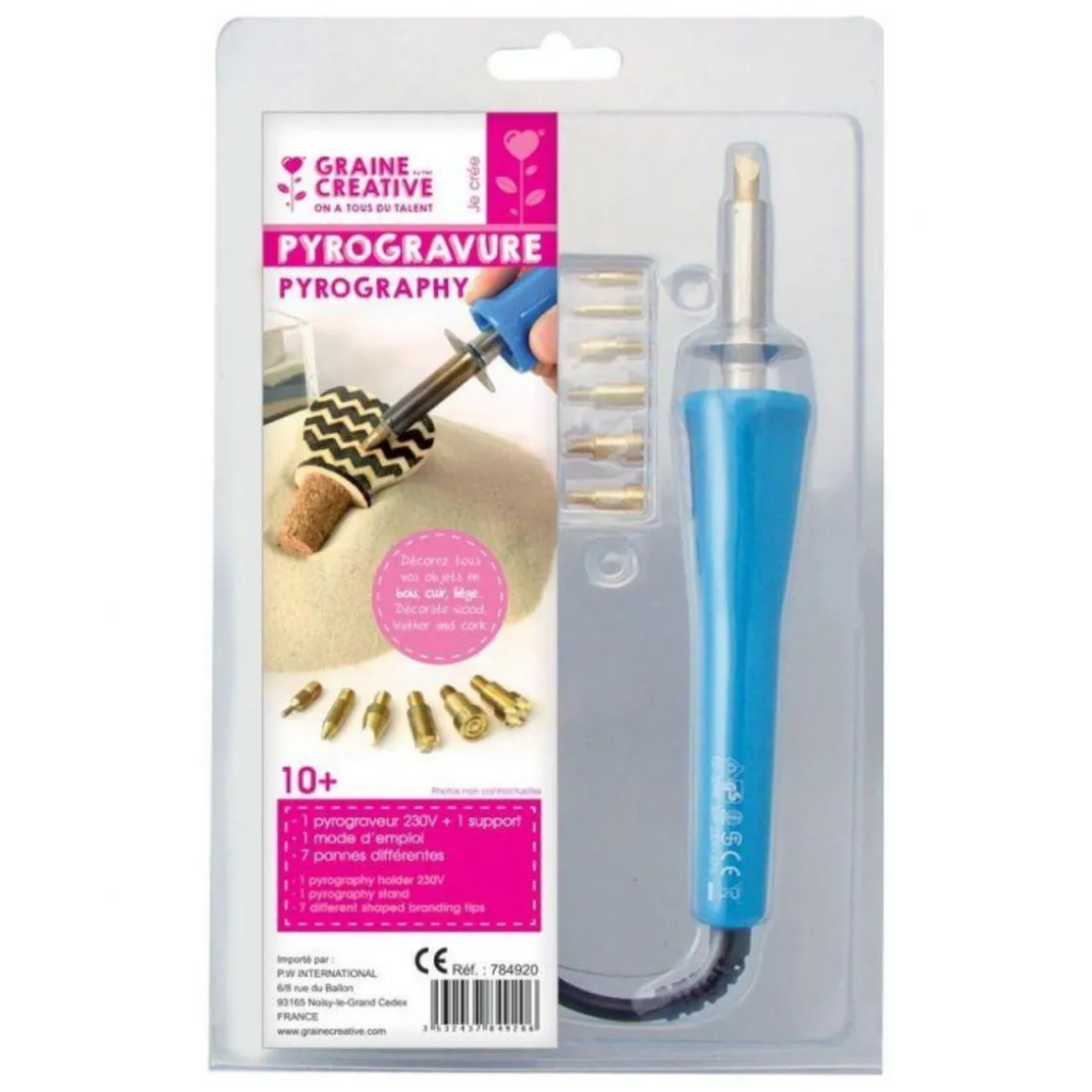 Avec ce pyrograveur personnalisez vos objets. Que ce soit du bois, du liège ou encore du cuir les différents embouts s’adaptent pour créer des motifs fins ou épais.