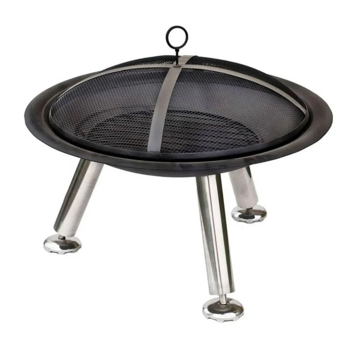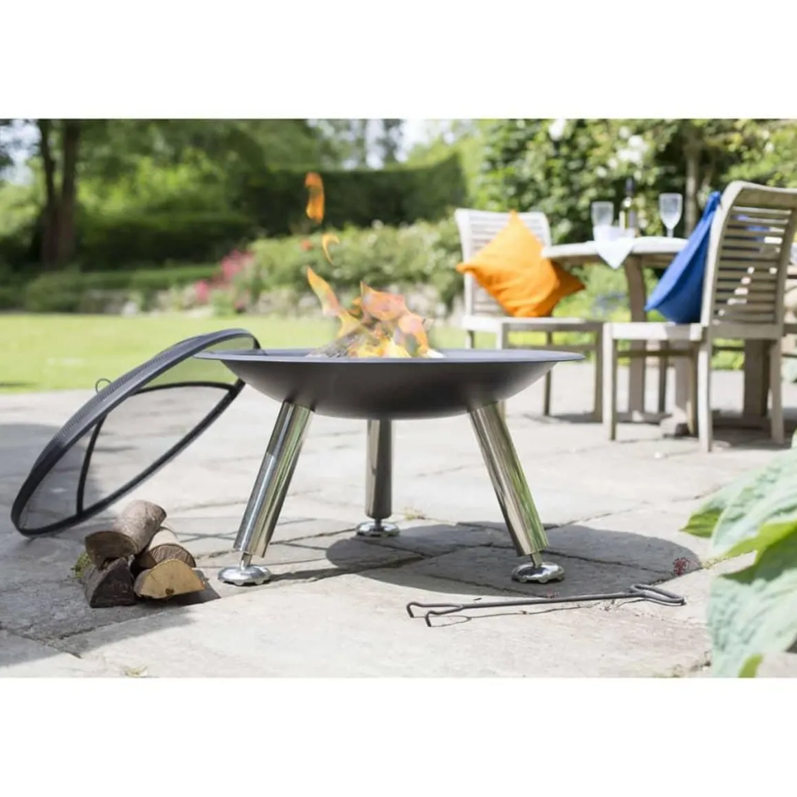 Avec le revetement en poudre noire et les pieds en acier inoxydable, le foyer est un veritable attrait avec un grand bol de 75 centimetres de diametre pouvant accueillir de grands morceaux de bois de chauffage. Les pieds reglables garantissent une position sur une surface solide et ferme. Grace au revetement du protecteur de feu, lorsque vous allumez les morceaux de bois, toutes les braises et les cendres produites par le feu seront gardees dedans.