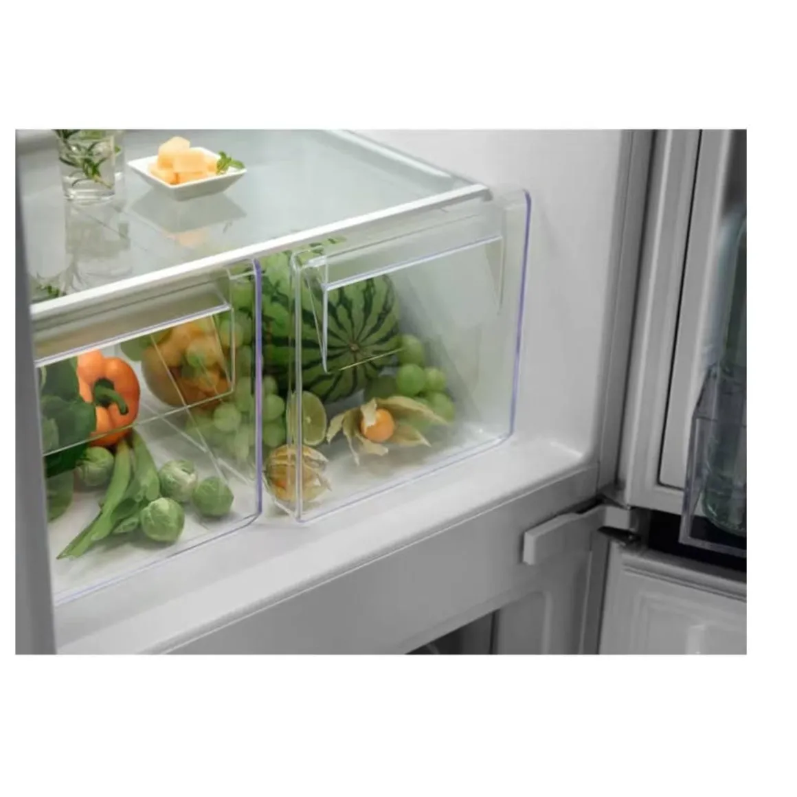 Equipement réfrigérateur : Compartiment crèmerie, 2 supports à œufs, Compartiment basse température, Bac à légumes avec contrôle d’humidité.