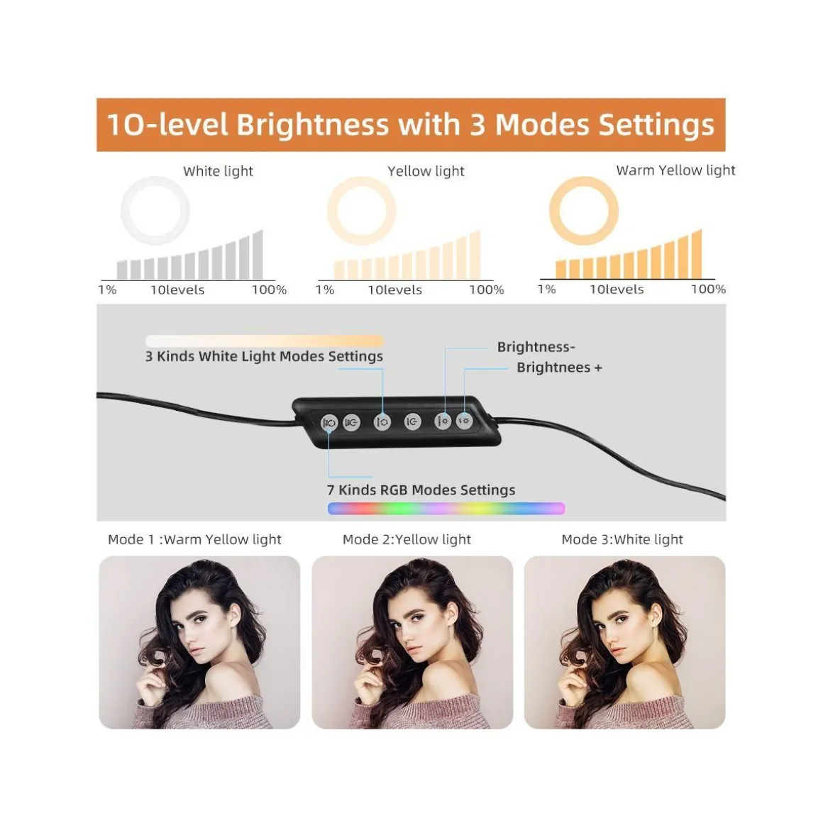 | Avantages | Lumière réglable : 3 modes de couleurs blanches et 7 modes de couleurs. | |