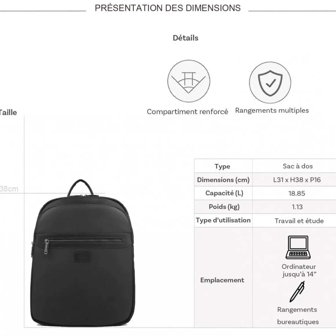1 compartiment renforcé pouvant contenir un ordinateur portable (14 max) ou une tablette dans le compartiment central,
