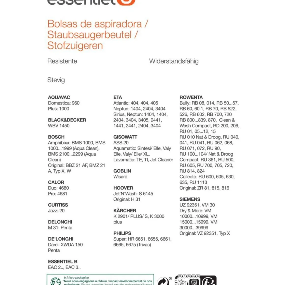 | Marque(s) compatible(s) Aspirateur | Bosch, Calor, Rowenta, EssentielB, Hoover, Philips, Siemens | |