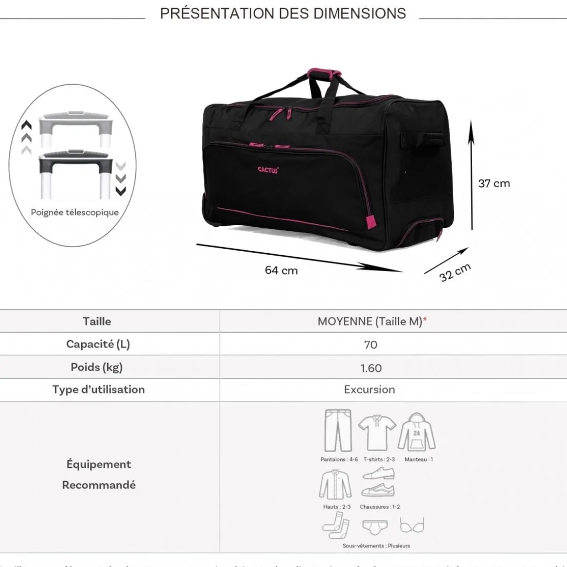 Les dimensions indiquées sont les dimensions extérieures des bagages, comprenant poignées, roulettes, pieds, poches latérales et autres éléments extérieurs.