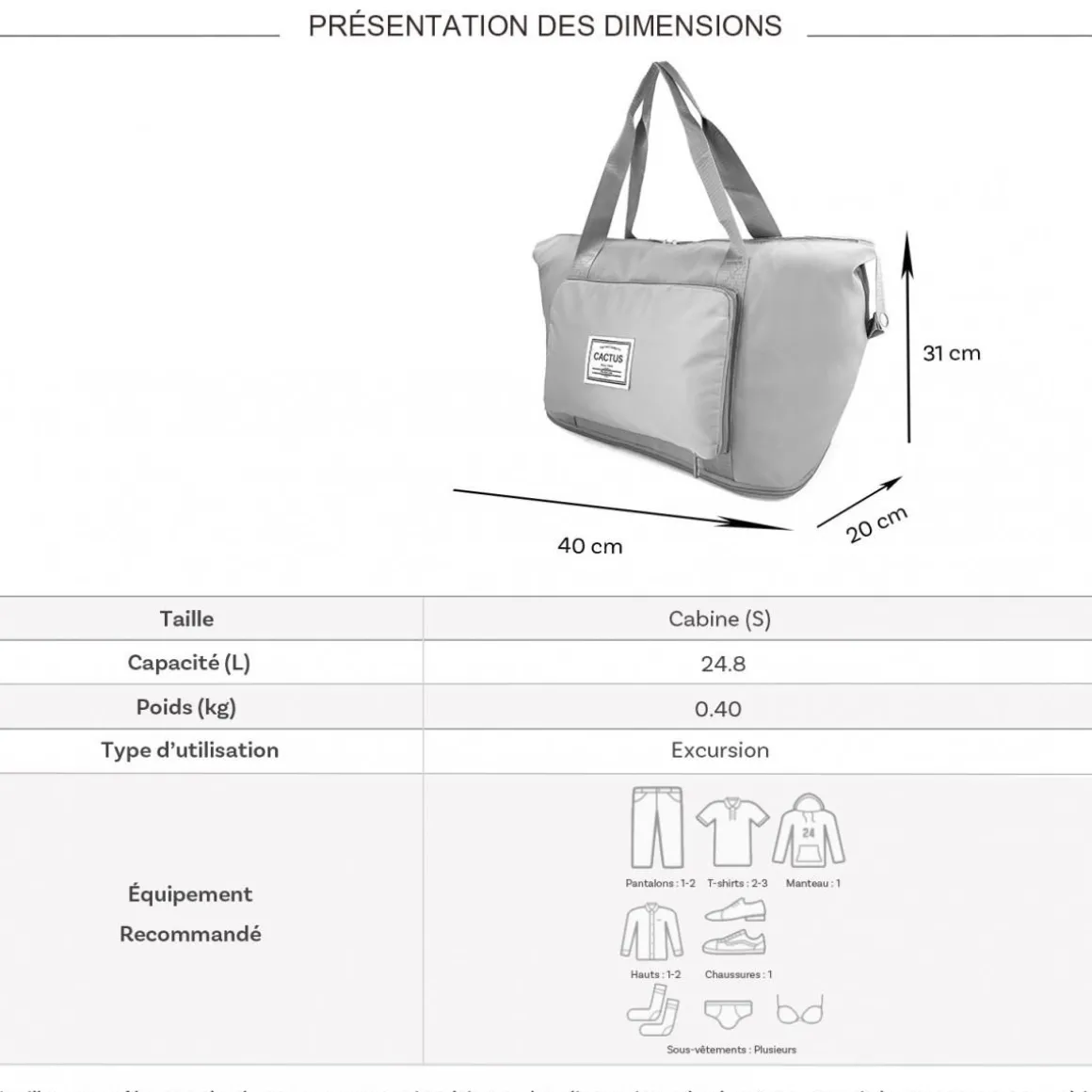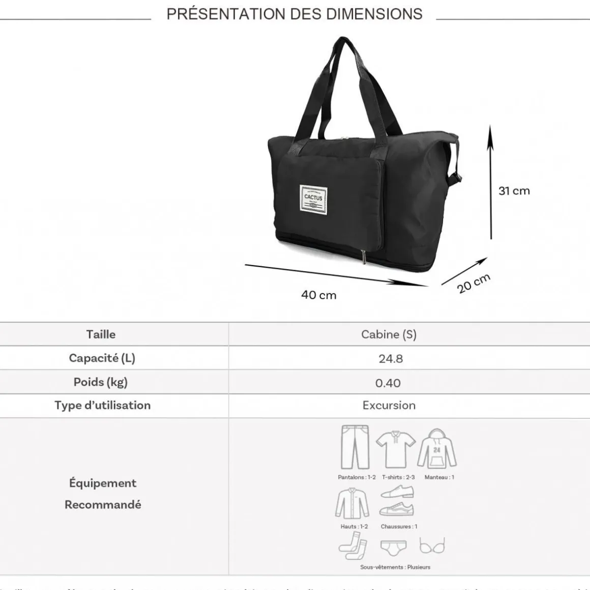 Les dimensions indiquées sont les dimensions extérieures des bagages, comprenant poignées, roulettes, pieds, poches latérales et autres éléments extérieurs.