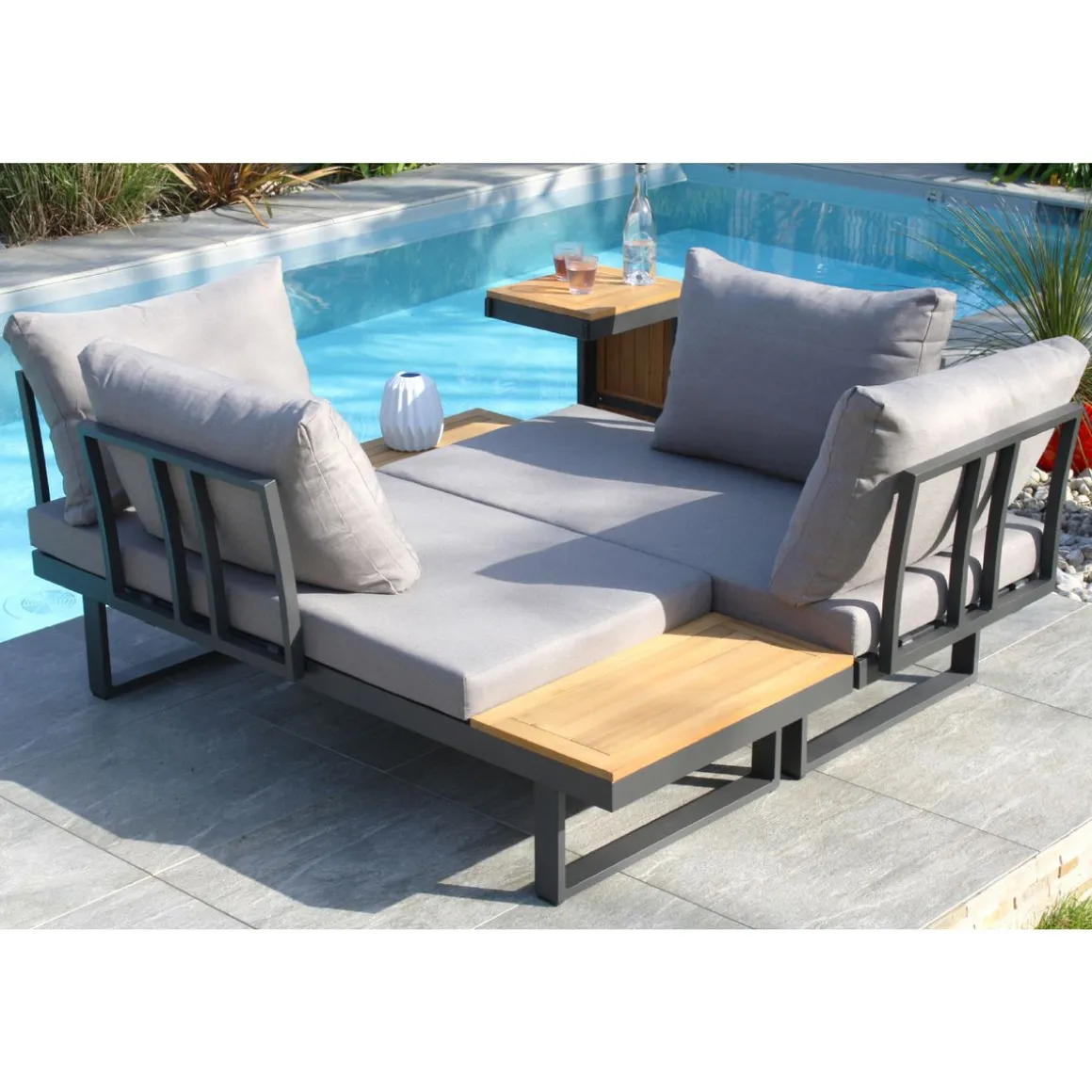 Le salon de jardin TOKYO en aluminium gris anthracite est modulable à souhaits : le salon d’angle devient lit, sa table basse devient une console… Ses coussins gris clair très épais sont la garantie d’un confort optimal.Ensemble composé de : une table basse plateau bois d’acacia, 2 méridiennes 2 places, 2 coussins d’assises et 4 coussins de dossier. Tous les coussins sont déhoussables.