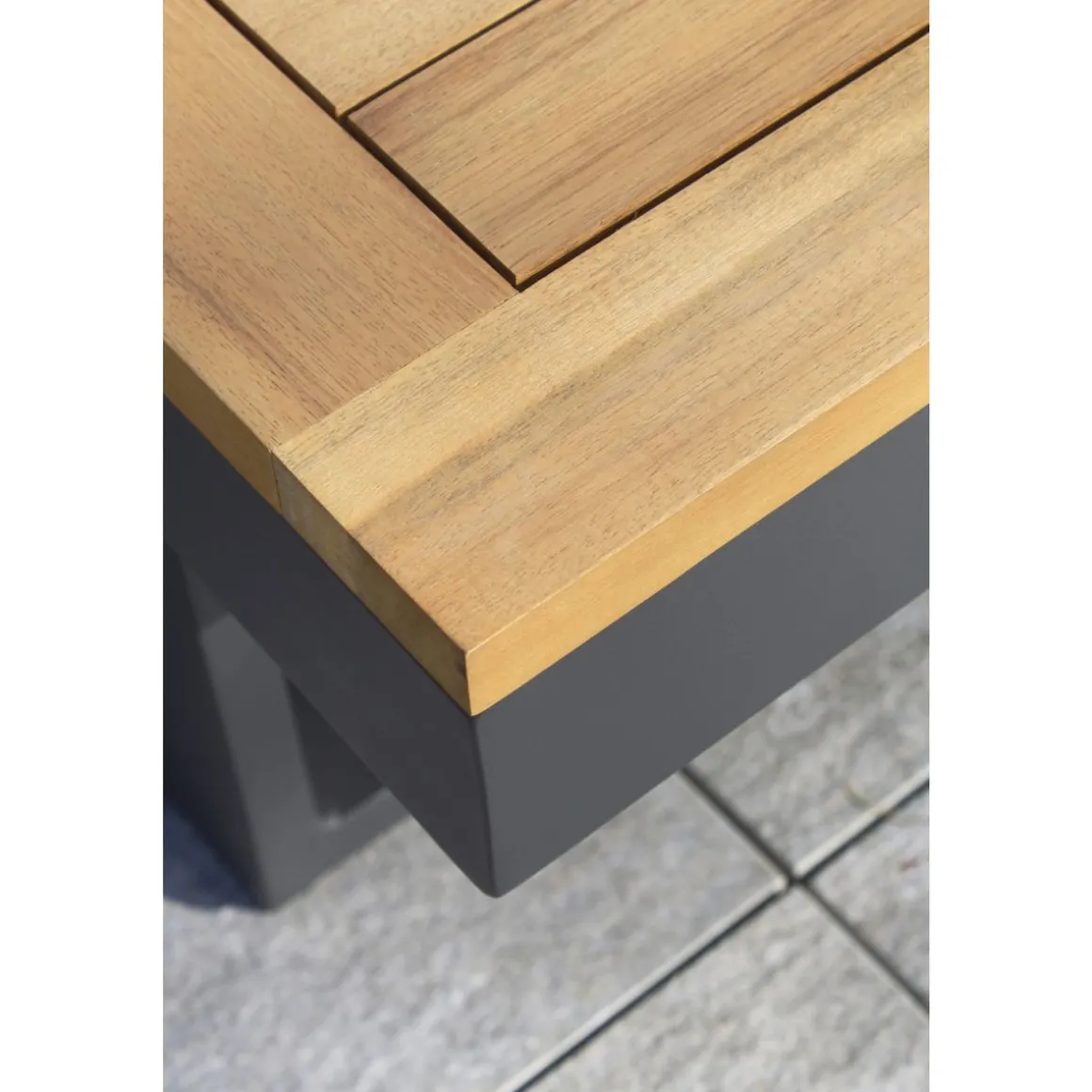 Structure : aluminiumPlateaux (table et banquette) : bois d’acaciaCoussins : polyester