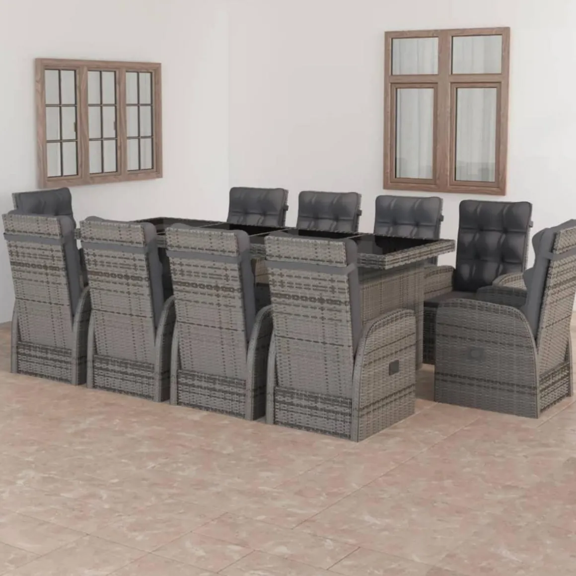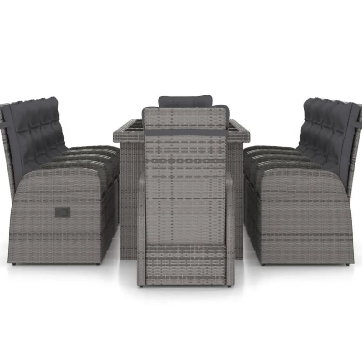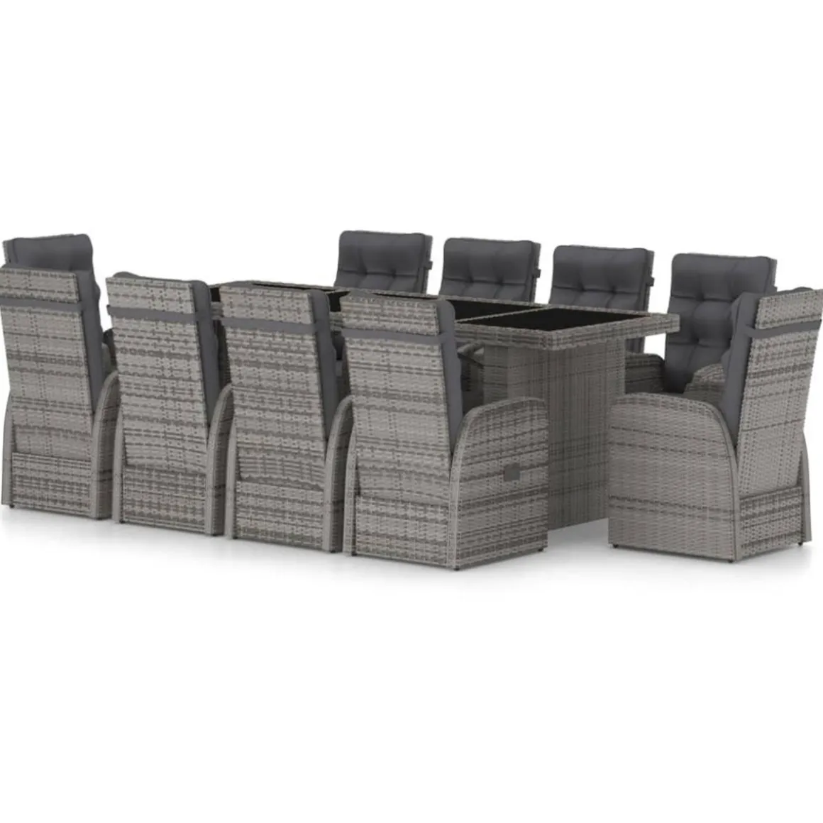 Cet ensemble de meubles de jardin est dote d’un cadre robuste en acier enduit de poudre, tres stable et durable. La resine tressee rend cet ensemble de salle a manger facile a nettoyer, resistant a l’usure et adapte a une utilisation a l’exterieur. Le dessus de table en verre est facile a nettoyer avec un chiffon humide. Les chaises inclinables offrent le plus grand confort d’assise et un excellent soutien. Le dossier est facilement reglable selon votre desir en utilisant le bouton au cote. Les chaises avec repose-pied apportent egalement un confort supplementaire. De plus, les coussins d’assise et de dossier epais et moelleux sont egalement tres confortables.