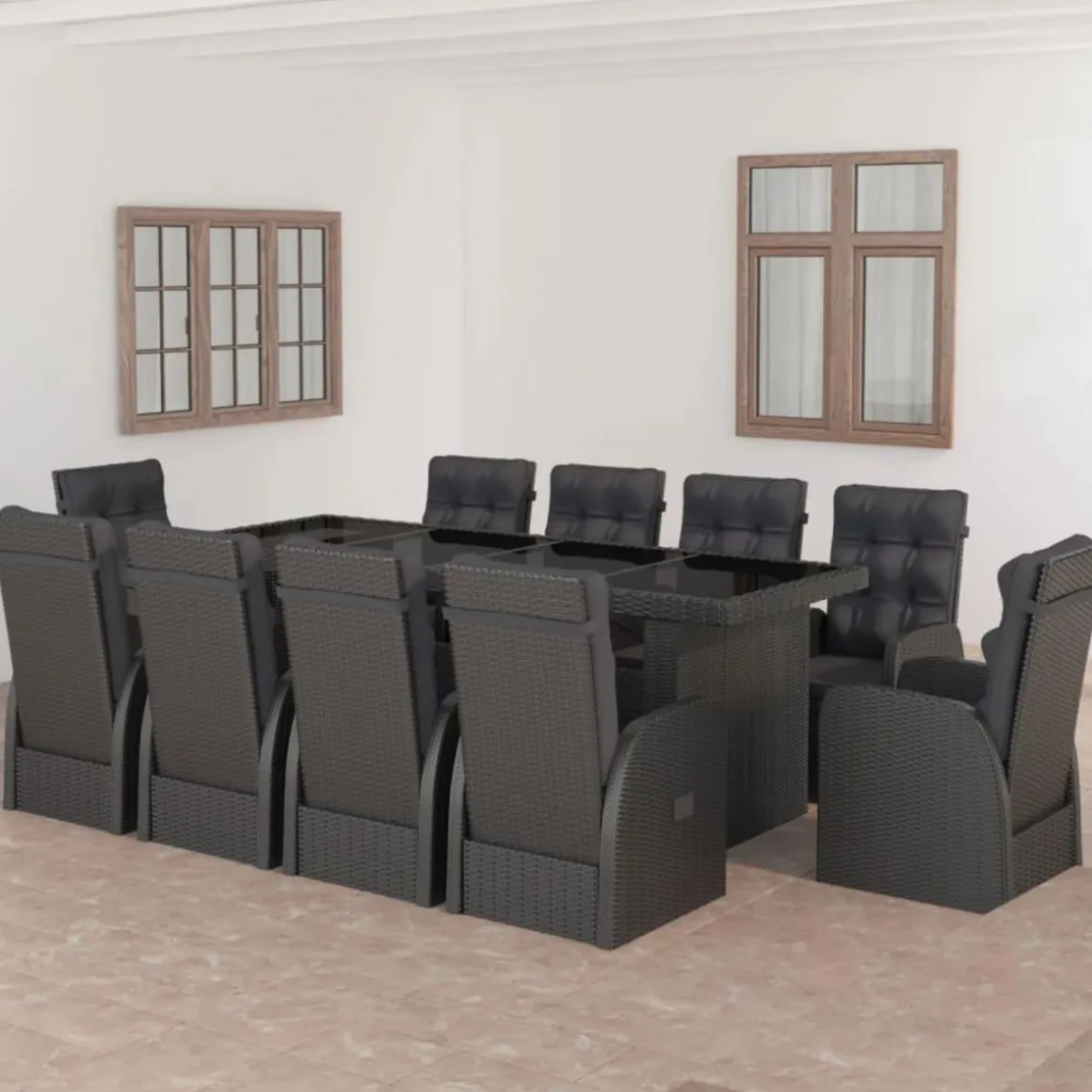 Cet ensemble de meubles de jardin est dote d’un cadre robuste en acier enduit de poudre, tres stable et durable. La resine tressee rend cet ensemble de salle a manger facile a nettoyer, resistant a l’usure et adapte a une utilisation a l’exterieur. Le dessus de table en verre est facile a nettoyer avec un chiffon humide. Les chaises inclinables offrent le plus grand confort d’assise et un excellent soutien. Le dossier est facilement reglable selon votre desir en utilisant le bouton au cote. Les chaises avec repose-pied apportent egalement un confort supplementaire. De plus, les coussins d’assise et de dossier epais et moelleux sont egalement tres confortables.