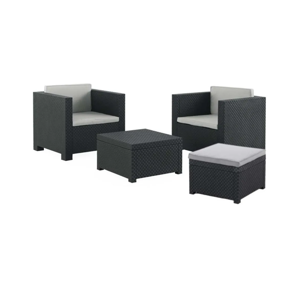 Le salon de jardin 3 places Ankara s’adapte tout aussi bien à une utilisation exterieure qu’interieure grâce à sa composition en resine injectee. Cet ensemble fabrique en Espagne est fabriquee en resine recyclee sans composants metalliques afin d’eviter tout problème de rouille et facilite son entretien. Il est dote d’une assise confortable et resistante à l’eau grâce à des coussins dehoussables, lavables et en tissu deperlant.