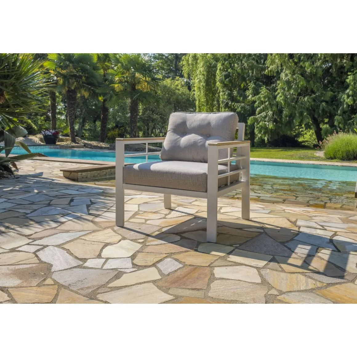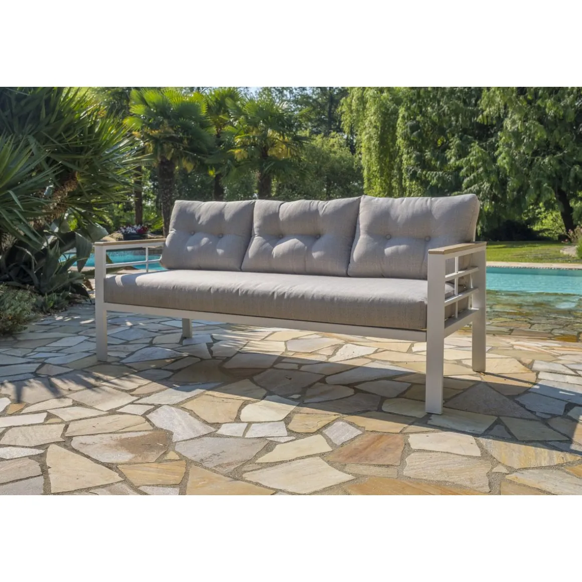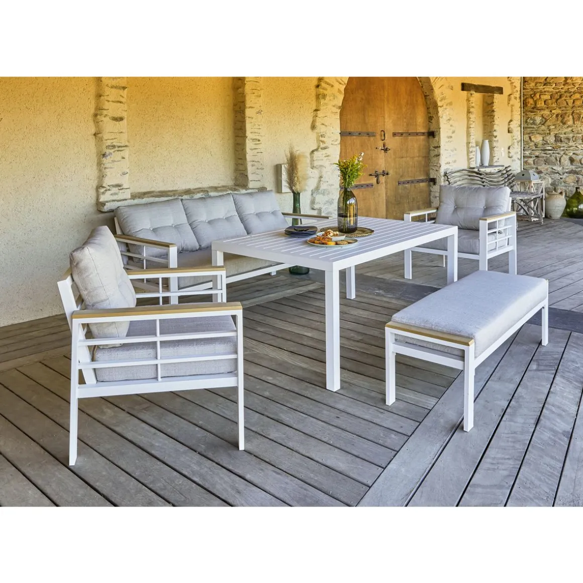 Profitez de votre extérieur, jardin ou terrasse, avec l’ensemble repas de jardin Cayenne-S3. Il est composé d’une table de jardin hauteur 67 cm, d’un canapé de jardin 3 places, de 2 fauteuils de jardin et d’1 banc 2 places pouvant accueillir 7 personnes. Il est conçu en aluminium blanc mat et dispose d’accoudoirs en composite imitation bois. Le salon bas de jardin Cayenne 7 places allie confort et praticité d’une table de repas pour passer de très bons moments conviviaux.