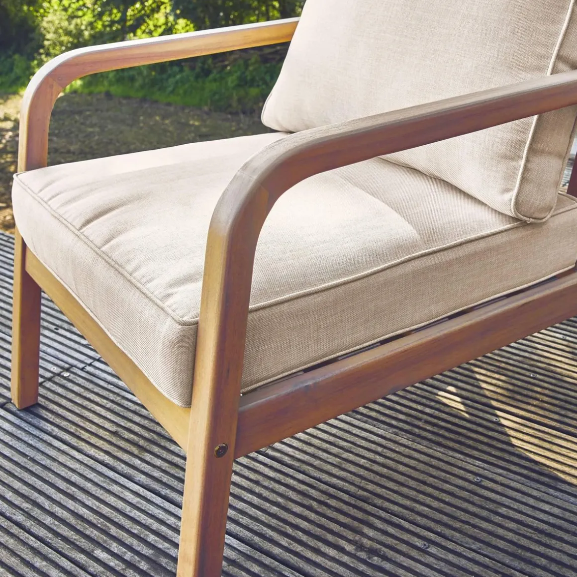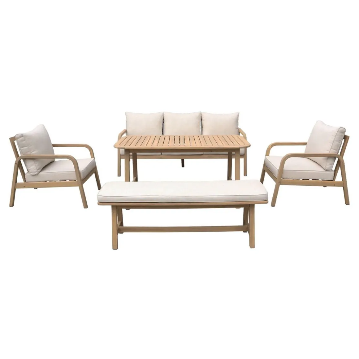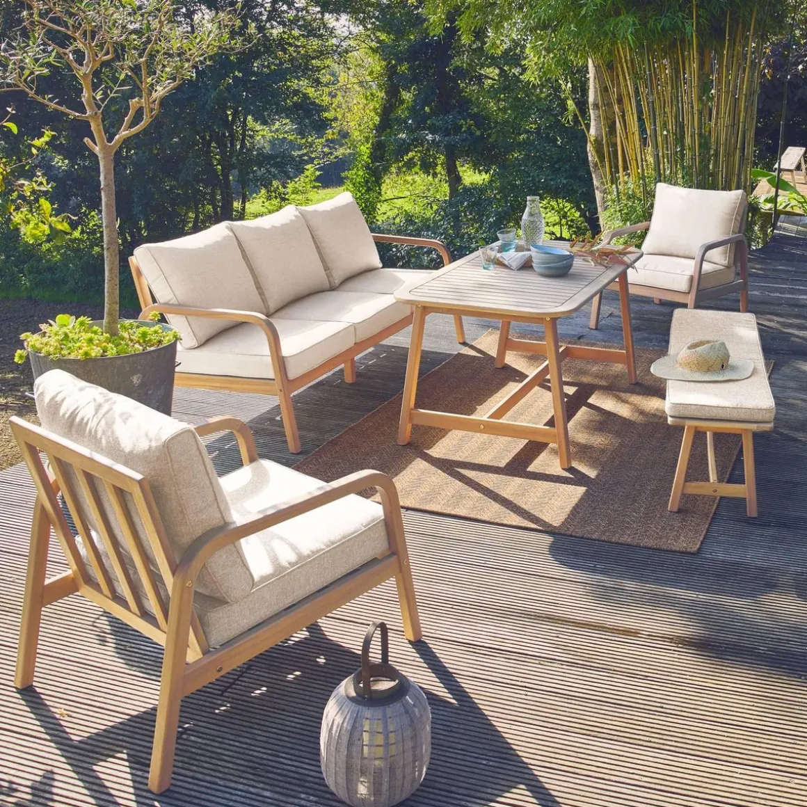 Le salon de jardin Carnota Dining est à la fois moderne et confortable. Conçu en bois d’acacia, la structure est robuste, durable et facile d’entretien. Sa jolie couleur naturelle se fondra parfaitement dans votre jardin. Les coussins en polyester sont déhoussables pour un entretien plus facile. Avec une épaisseur de 12 cm, vous profiterez d’un confort optimal pour vous détendre avec votre famille ou vos amis. L’ensemble comprend une table rectangulaire, un canapé, un banc et deux fauteuils. La structure de chaque module est conçue avec de jolies bords arrondis, cela apporte une touche contemporaine et stylée à cet ensemble.