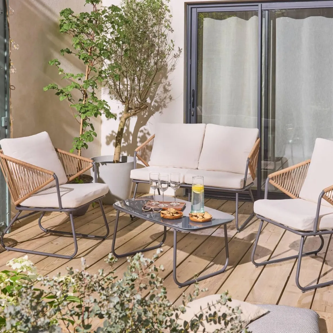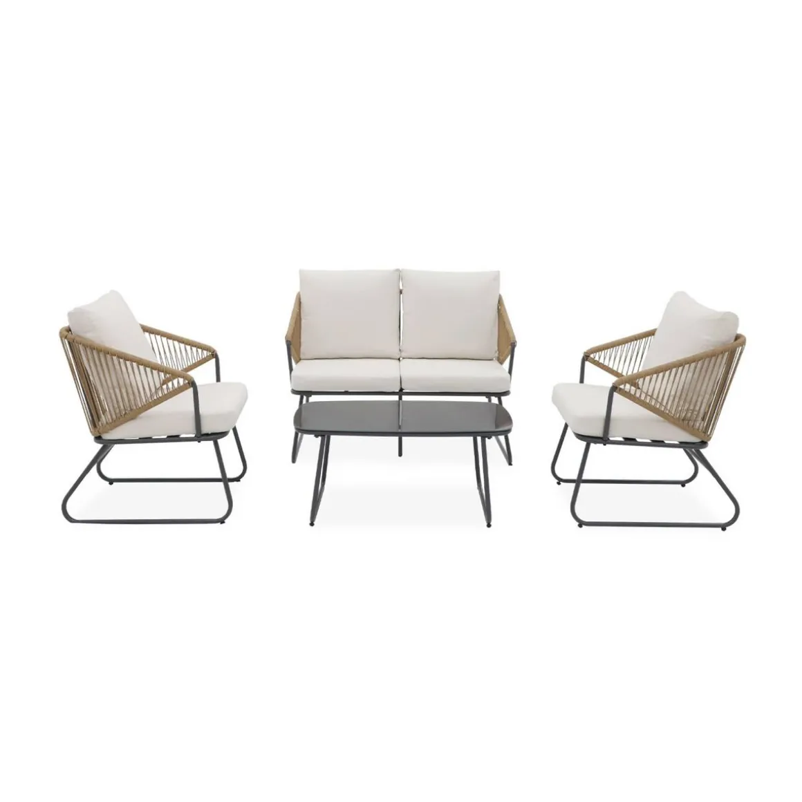Sa structure en acier galvanisé assure une durabilité exceptionnelle. Sa table basse avec plateau en verre securit de 5mm est solide et résistante. Pour votre confort, les coussins d’assise sont épais de 7cm et les dossiers de 18cm. De plus, ils sont déhoussables pour être nettoyés facilement.