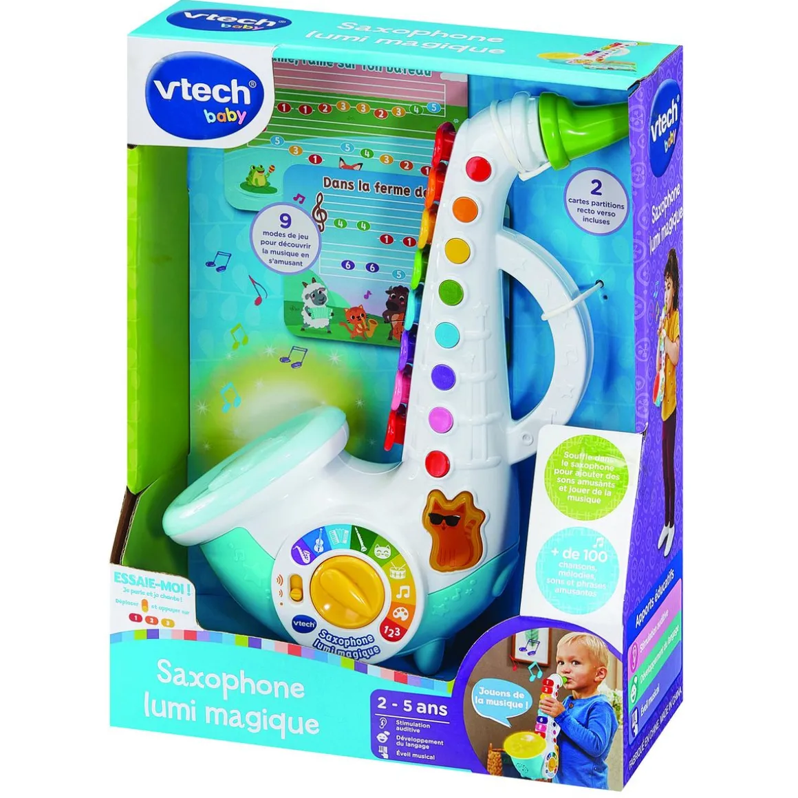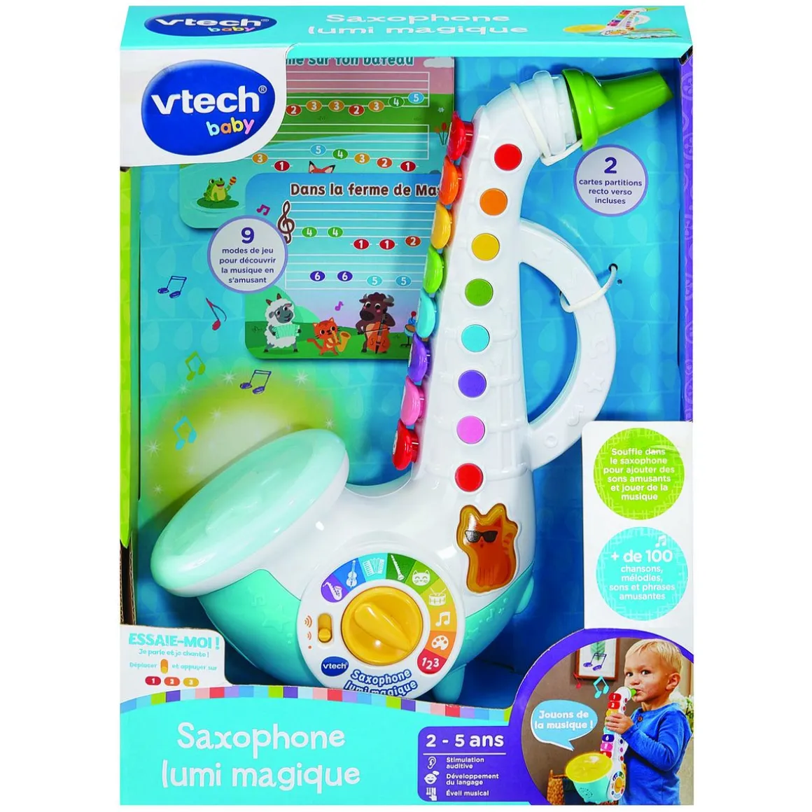 C’est parti pour un concert ! Avec son Saxophone lumi magique, l’enfant découvre la musique, les instruments, les chiffres et les couleurs sur des rythmes de jazz. Accompagné de Scat, le chat musicien, il peut choisir un instrument ou souffler dans son saxophone pour jouer une mélodie ou rejoindre un groupe de jazz. Les deux cartes partitions lui permettent de faire ses premiers pas de saxophoniste sur des mélodies connues et la poignée lui permet d’emporter son saxophone partout pour improviser un concert !