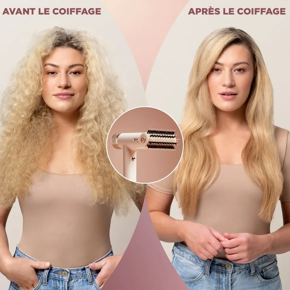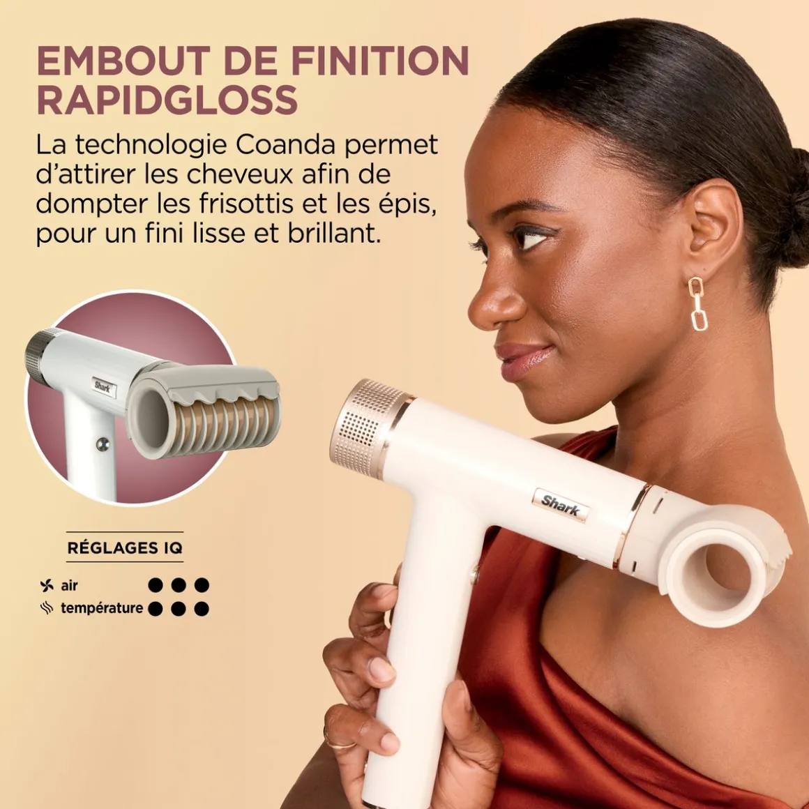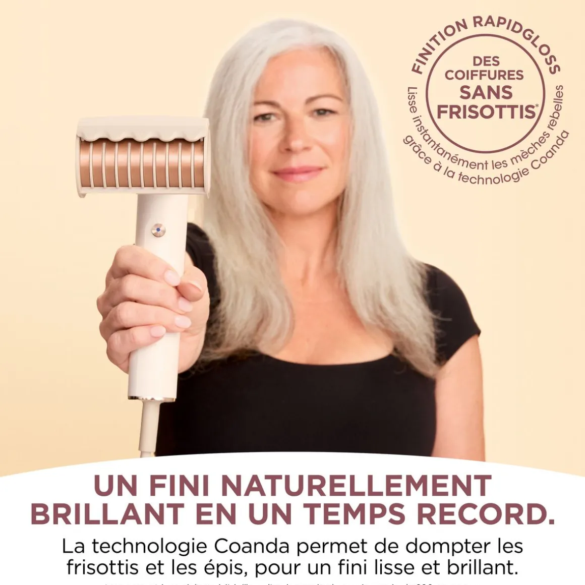 - Embout RapidGloss : Dompte instantanément les épis pour des coiffures haute brillance. À l’aide de la technologie Coanda, cet accessoire de coiffage innovant utilise deux flux d’air puissants pour attirer les cheveux et dompter les frisottis et les épis, pour un fini lisse et brillant.