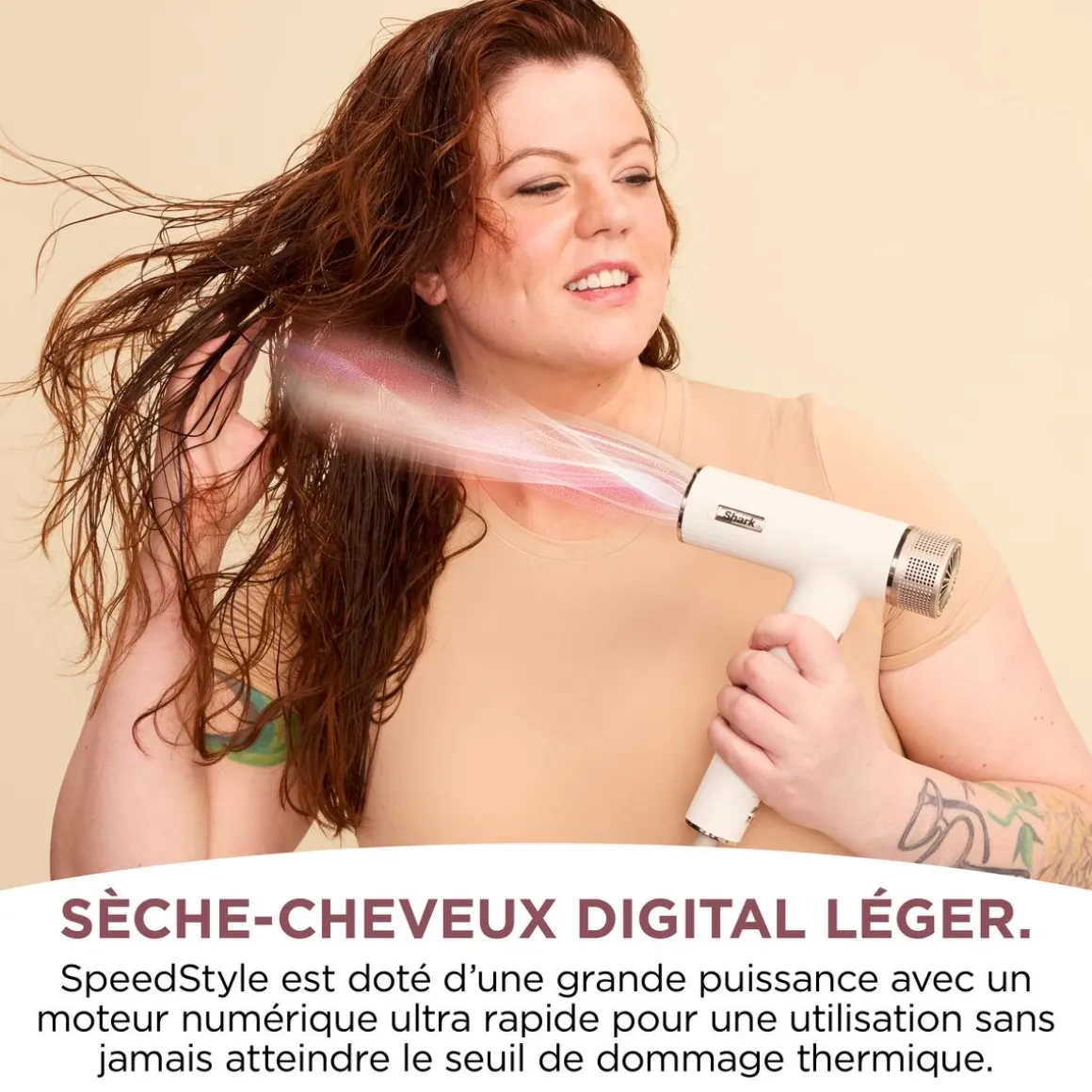 Chaque embout sélectionne automatiquement le réglage optimal, mais vous pouvez aussi le modifier manuellement avec 3 réglages de température et de flux d’air. Appuyez sur le bouton Air froid pour refermer la cuticule du cheveu et fixer votre coiffure. Vous n’avez pas besoin d’une température brûlante pour réussir des coiffures de rêve. Toujours respectueux de vos cheveux, Shark SpeedStyle mesure et régule la température 1000 fois par seconde. La chaleur ne dépasse jamais 110 °C et n’atteint jamais le seuil de dommage thermique de 150 °C. Un sèche-cheveux peut être puissant et léger. Avec un peu plus de 750 g seulement, le SpeedStyle est facile à transporter et confortable à utiliser. Son design compact est parfait pour voyager.