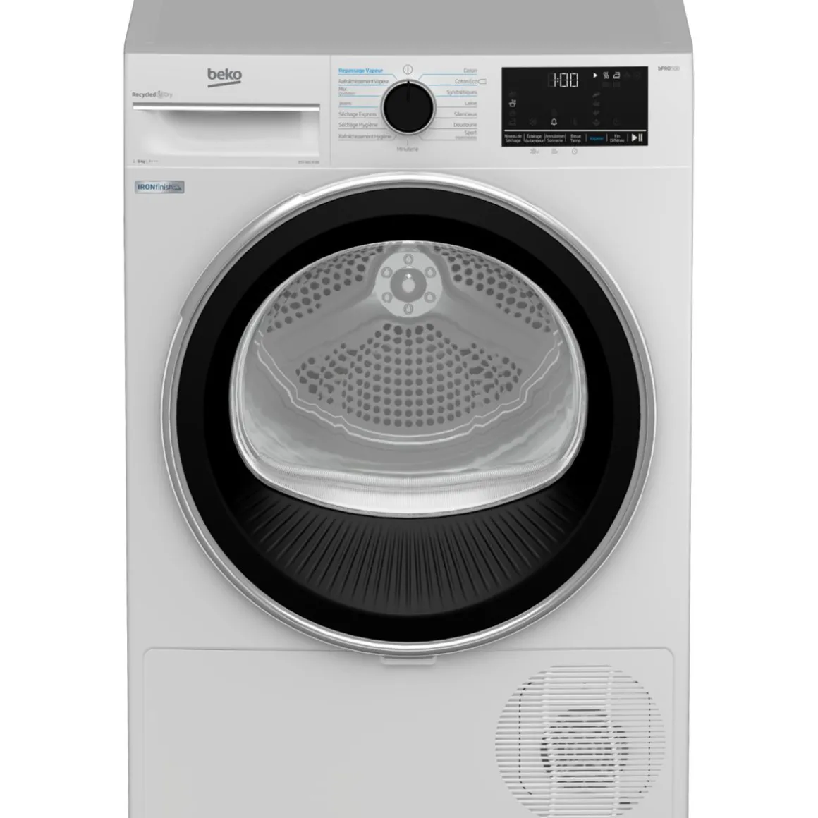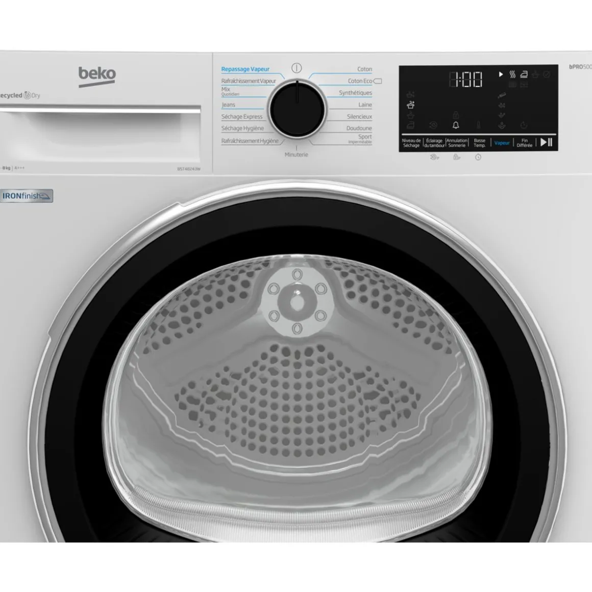Bénéficiez d’un sèche-linge avec une fabrication éco-responsable, 30% des composants de ce sèche-linge sont fabriqués à partir de matériaux recyclés et de bouteilles en plastique recyclées. Économique, ce sèche-linge dispose de la classe énergétique A+++. Il est doté de la puissance de la vapeur et du programme spécial « Repassage vapeur », la technologie IronFinish permet d’obtenir un résultat de vêtements prêts à l’emploi. Ce sèche-linge possède une capacité de séchage de 8 kg et 15 programmes de séchage ce qui est idéale pour une famille. De plus, vous pouvez programmer un départ différé jusqu’à 24h avant.