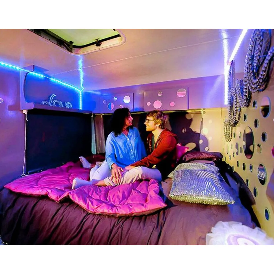 À la recherche d’une escapade romantique hors du commun ? Les Naturelles Insolites, situées Pronleroy en Picardie, propose à 2 personnes de passer 2 jours avec petit-déjeuner en caralove, caravane vintage aménagée en cocon romantique. Prenez place dans cette capsule temporelle installée à l’écart dans un écrin de verdure dépaysant, et délectez-vous de son confort sans pareil. Au milieu des bois, votre hébergement se démarque par ses tons roses et violets ainsi que ses lumières aux différentes couleurs. Un séjour inoubliable vous attend !