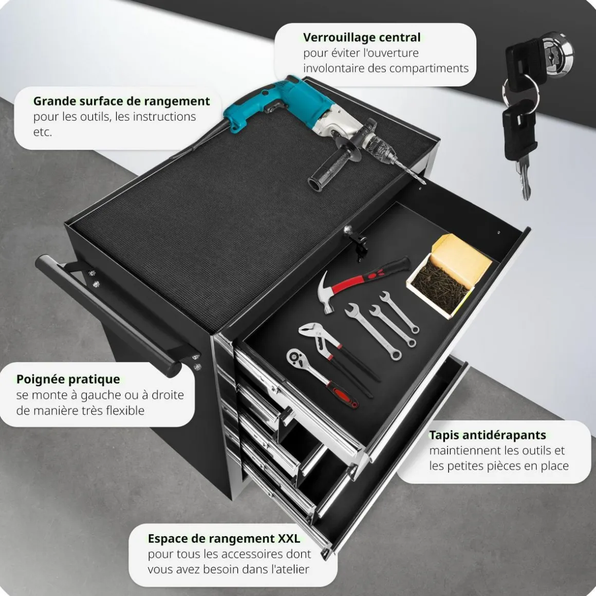 - Tapis antidérapants dans les tiroirs et sur le plateau.