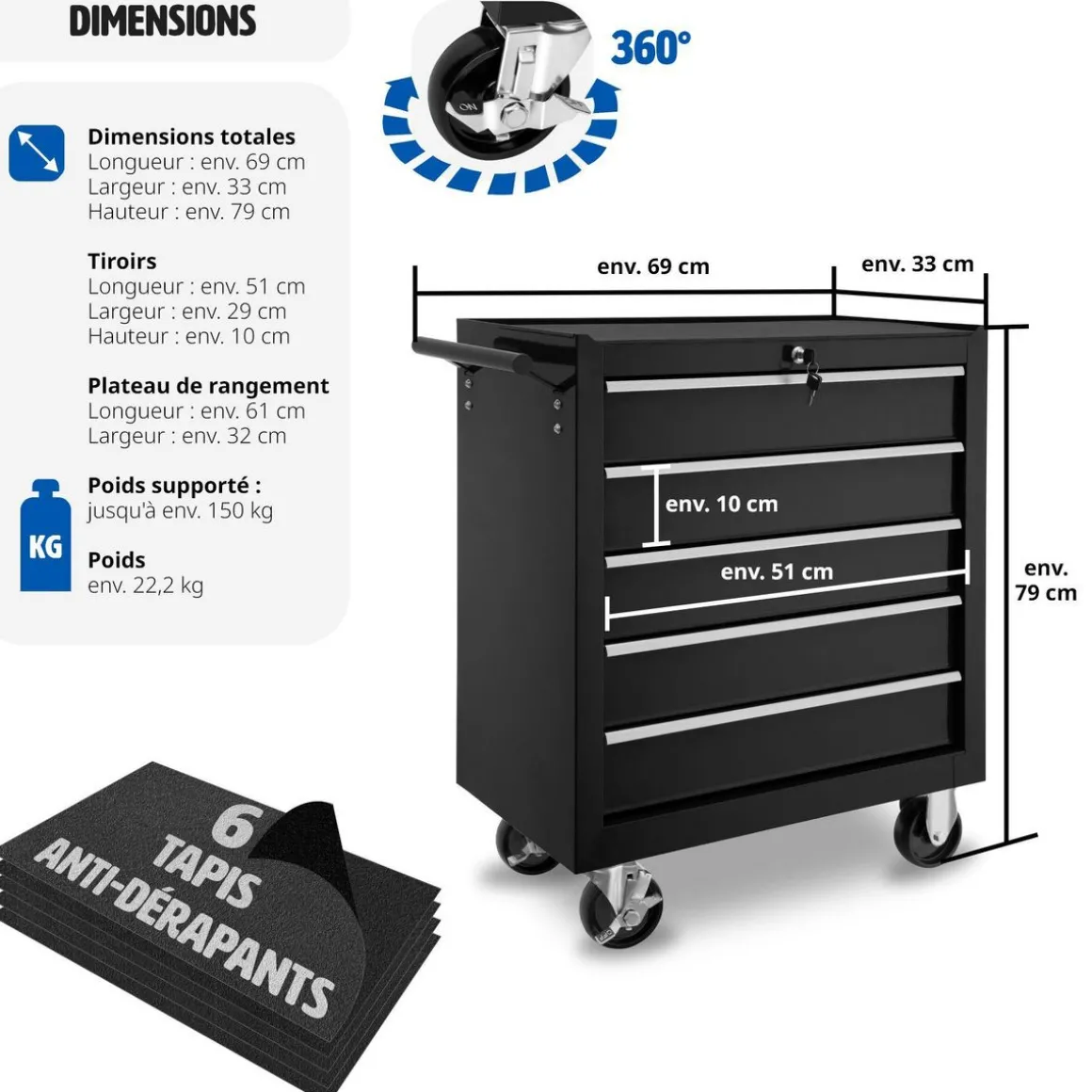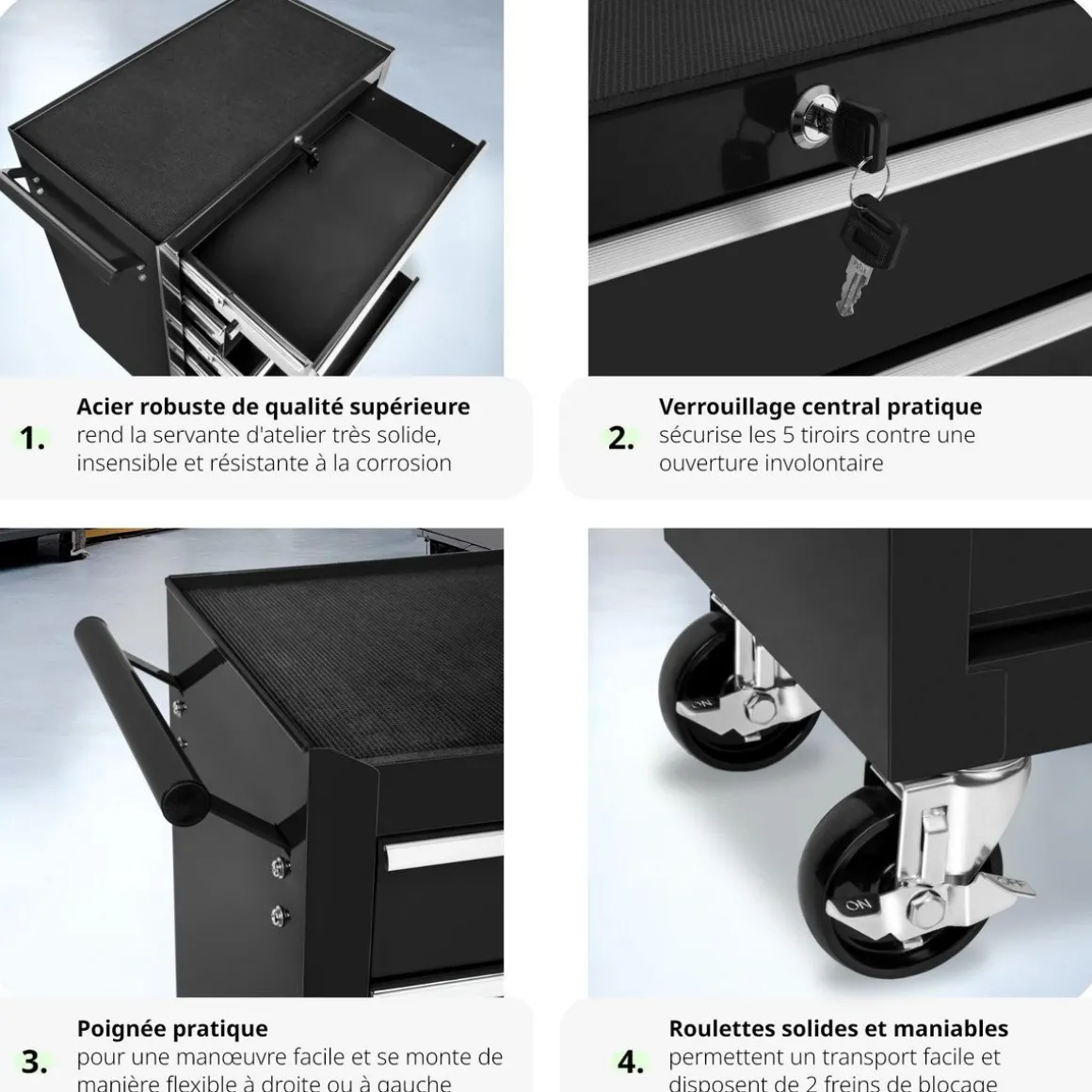 - Matériaux : Surface en Acier revêtu par poudre. / Acier. / Roues en Matière Plastique.