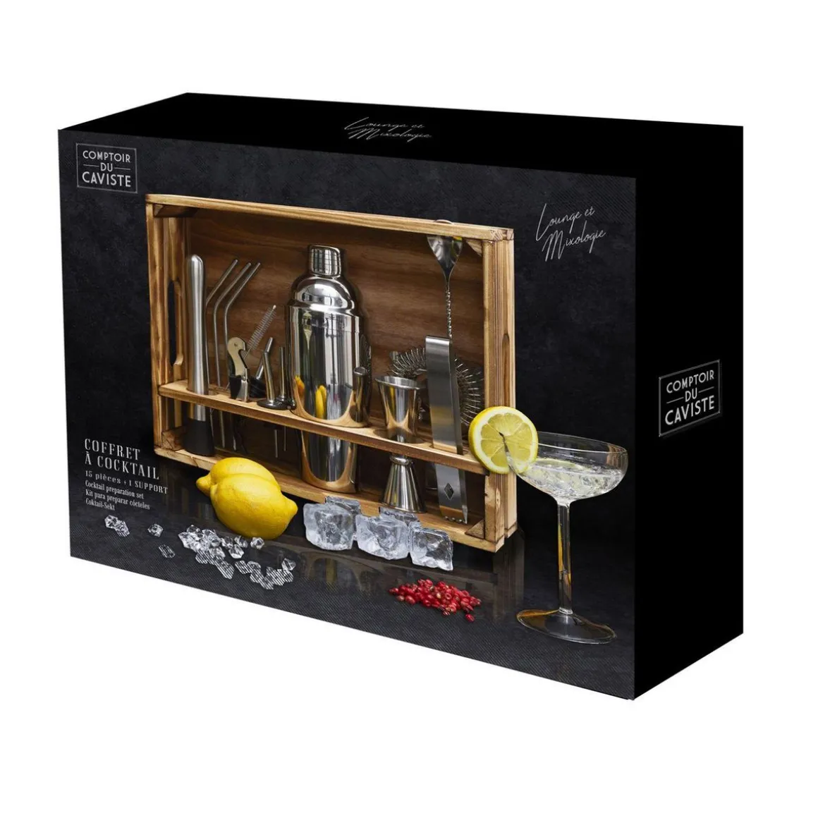 – Contient 1 shaker de 700 ml, 1 pilon, 1 passoire, 1 pince à glaçon, 1 verre doseur, 1 tire bouchons, 4 pailles, 1 goupillon et 3 bouchons bec verseur.