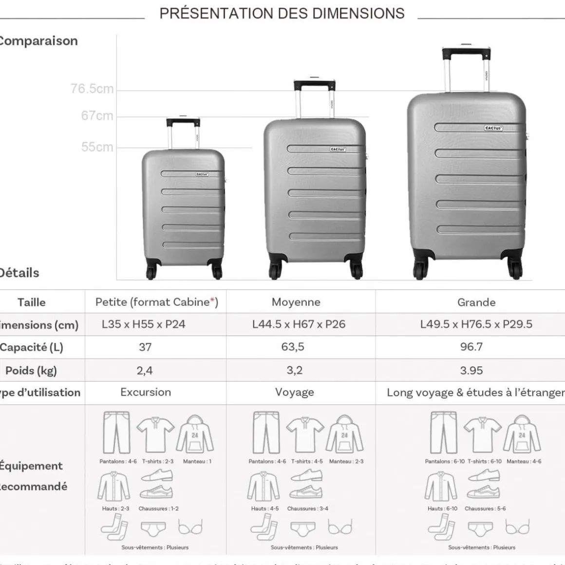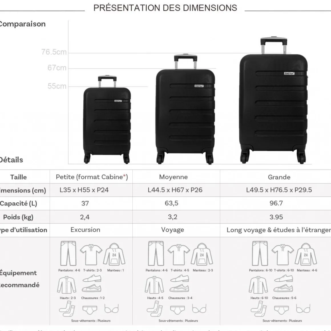 Les dimensions indiquées sont les dimensions extérieures des bagages, comprenant poignées, roulettes, pieds, poches latérales et autres éléments extérieurs.