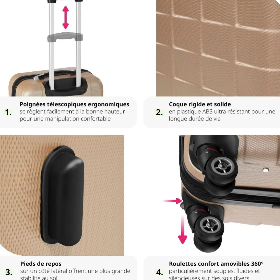 - Gain de place : les valises peuvent être rangées les unes dans les autres.