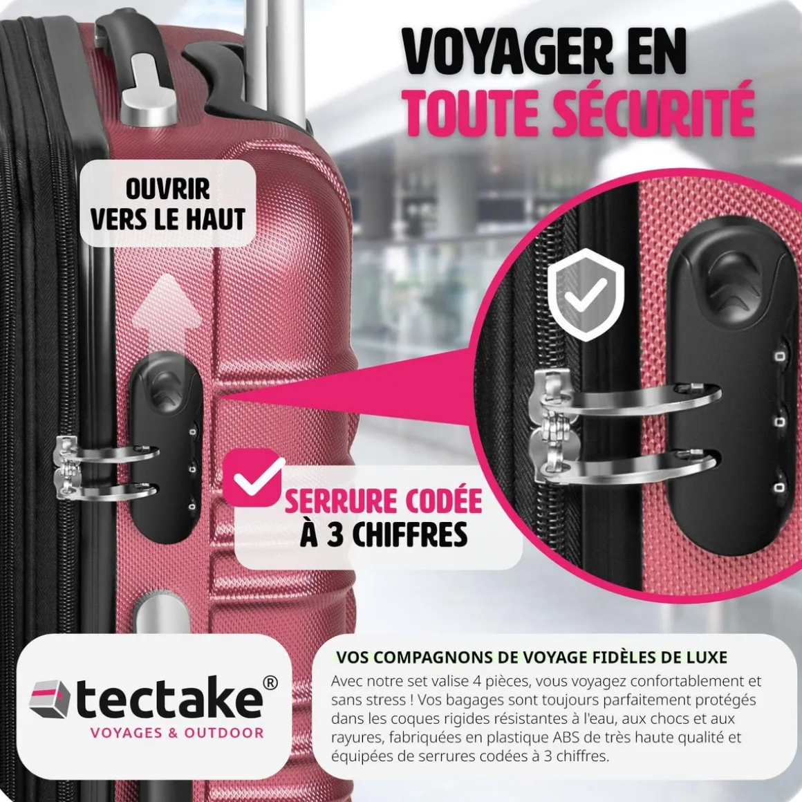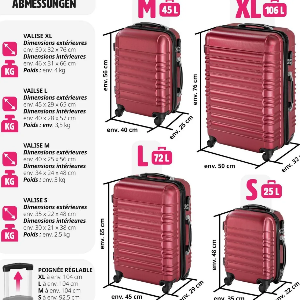 - Gain de place : les valises peuvent être rangées les unes dans les autres.