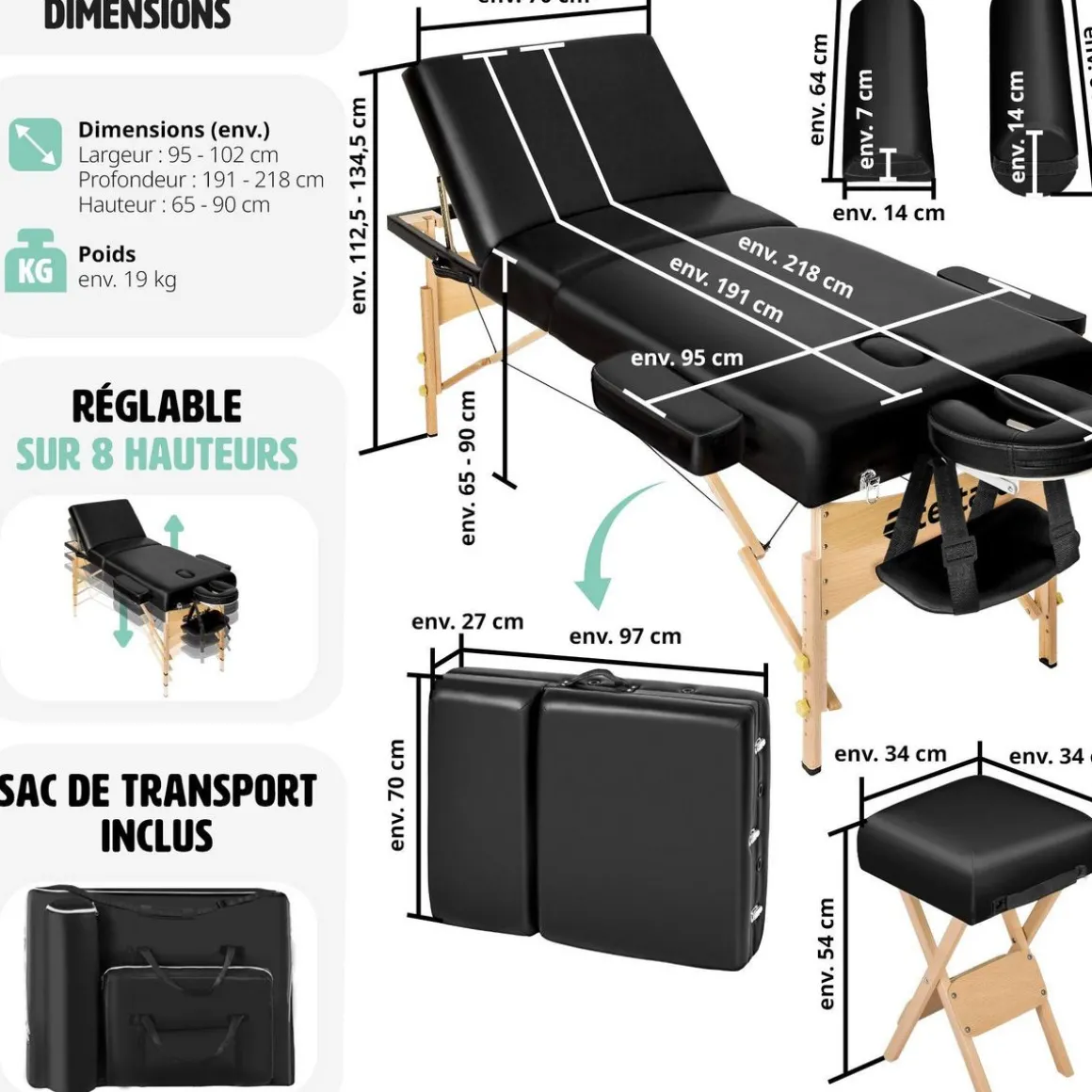 Cette table de massage est également réglable en hauteur, vous permettant de l’ajuster selon vos préférences pour une posture optimale pendant le massage. Avec ses dimensions de 218 x 102 x 65 – 90 cm, elle est conçue pour s’adapter à divers environnements et besoins. De plus, son sac de transport inclus facilite le transport et le stockage, vous permettant d’emporter votre table de massage où que vous alliez.
