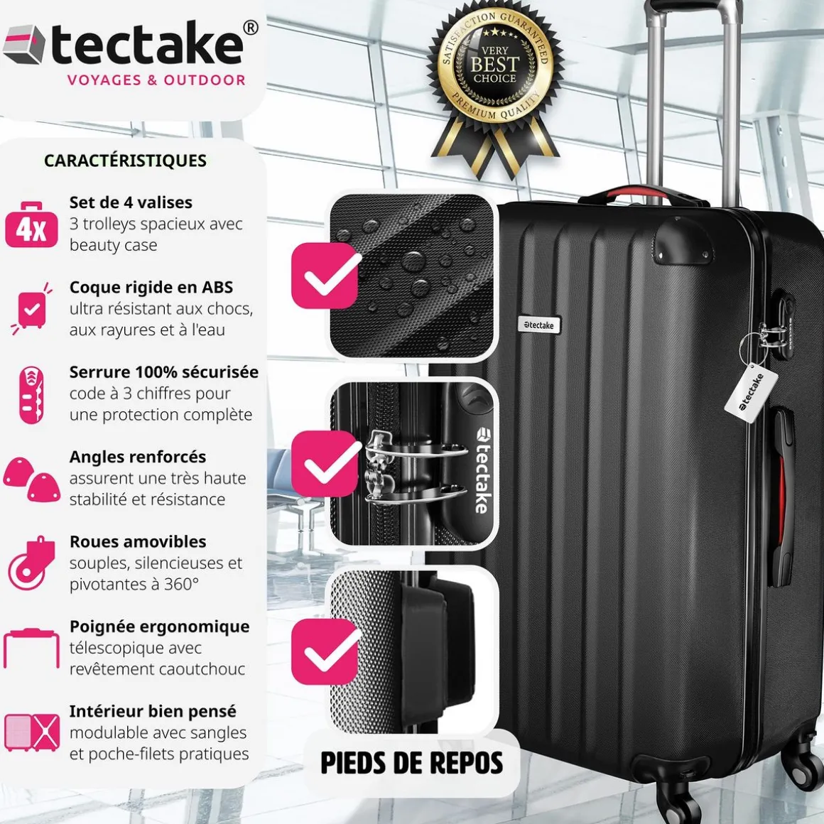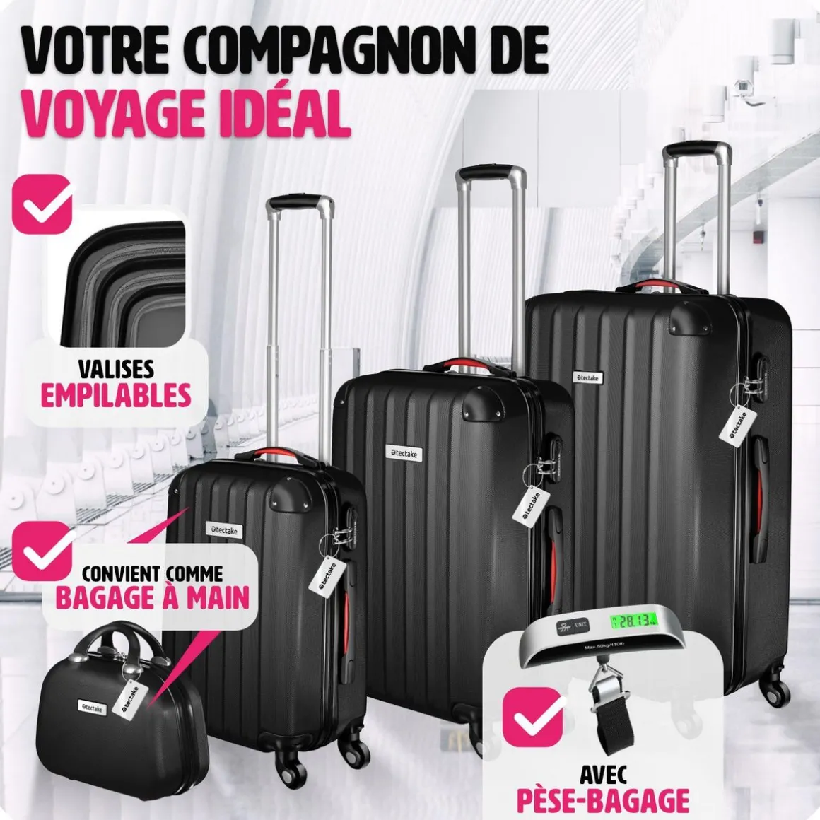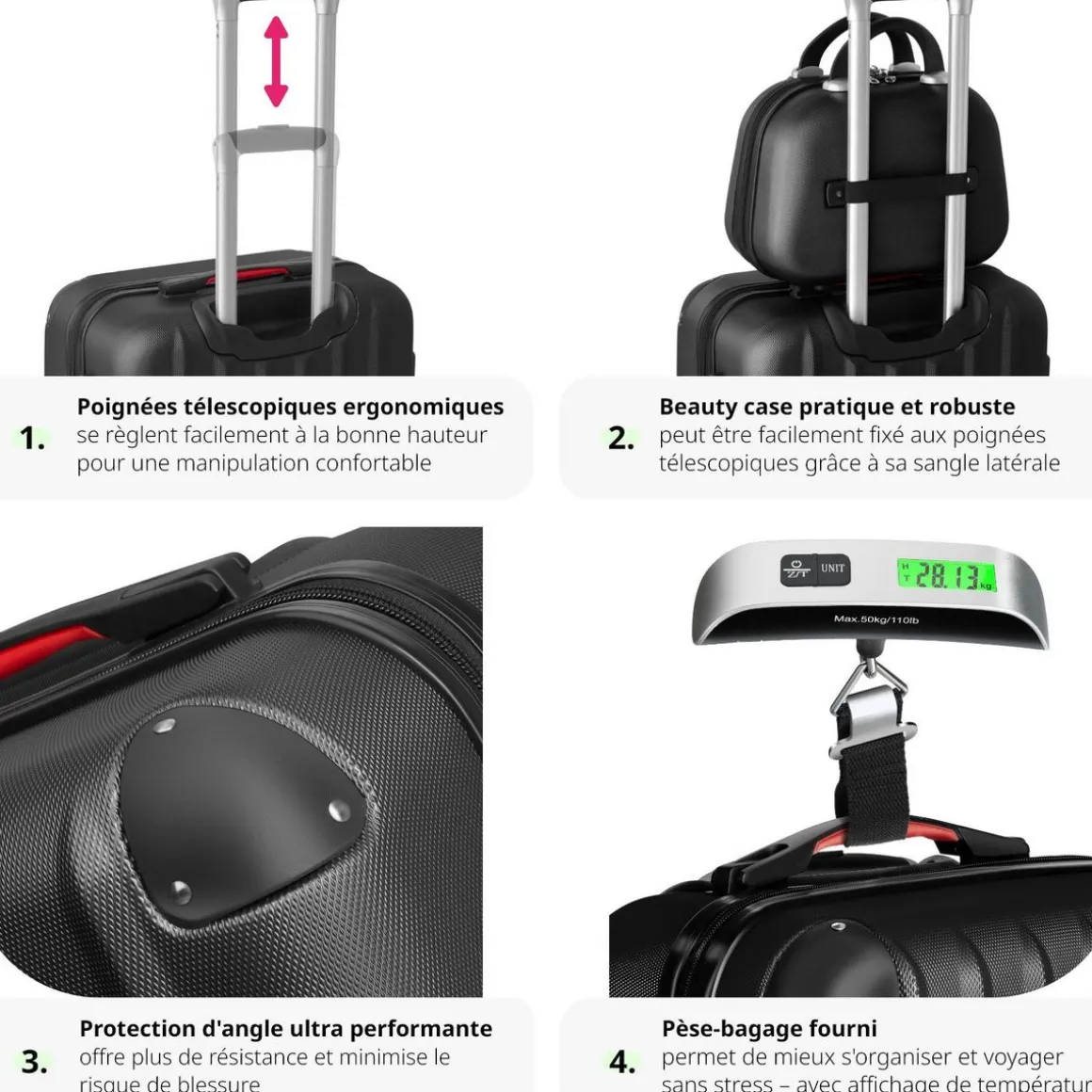 - Pèse-bagages et étiquette de valise incluses