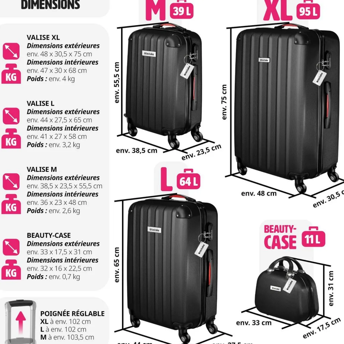 - Hauteur avec poignée télescopique déployée : env. 103,5 cm