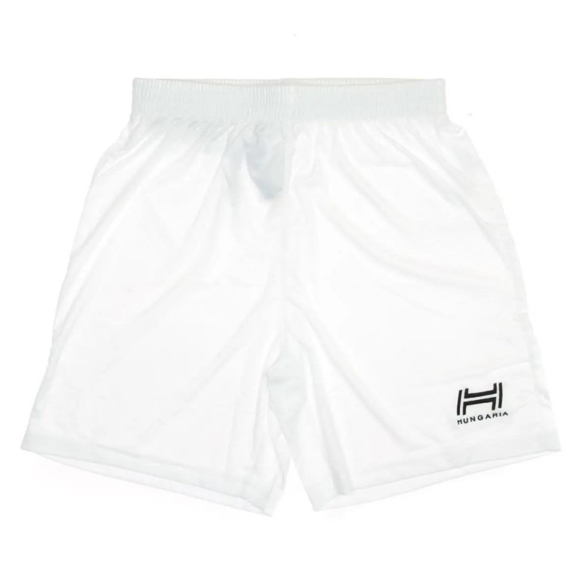 Short blanc pour homme de la marque Hungaria. Cordon de serrage à la taille Logo Hungaria brodé en noir sur la cuisse gauche Intégralement blanc Composition : 100% polyester