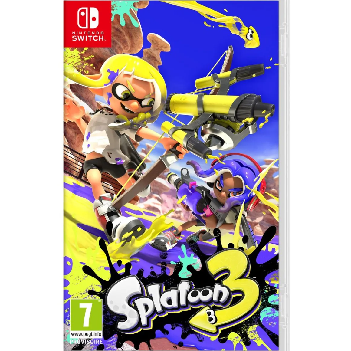 Après deux opus sur Wii U et Nintendo Switch, le jeu de tir coloré déploie un nouvel épisode riche en nouveautés pour accueillir les joueurs aguerris comme les nouveaux venus. Bienvenue à la Cité-Clabousse, une métropole qui ne dort jamais dans un désert post-apocalyptique où vivent les Inklings et les Octalings. Ces créatures espiègles à la pointe de la mode peuvent se transformer instantanément en calamars pour glisser dans les flaques de peinture à toute vitesse et ont comme sport national des affrontements frénétiques dans des arènes, à renfort de gros calibres ! Customisez votre personnage, choisissez votre arme de prédilection et lancez-vous dans des combats déjantés à 4 contre 4 en ligne pour monter dans les classements. Découvrez divers modes de jeux comme l’iconique Guerre de Territoire où l’objectif est de repeindre un maximum de surface aux couleurs de votre équipe et bien sûr… de liquider vos adversaires !