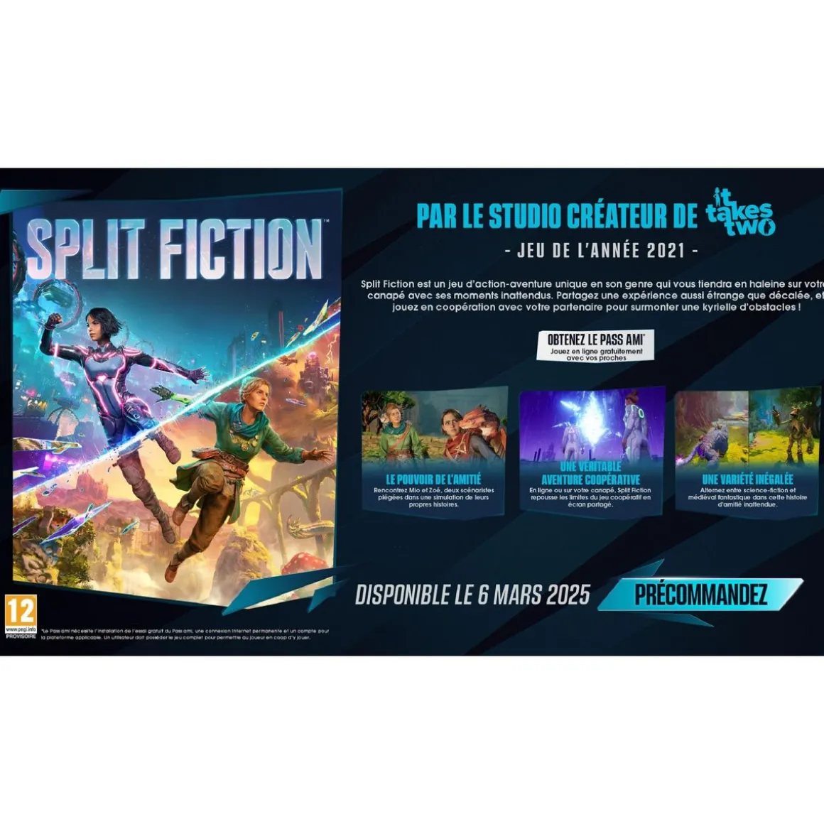 Split Fiction est une expérience d’action-aventure palpitante où s’enchaînent les moments inattendus. Domptez d’adorables dragons, incarnez des cyber-ninjas, échappez à des trolls terrifiants ou esquivez les voitures volantes lancées par un robot de stationnement. Préparez-vous à vivre une expérience étrange, sauvage et conçue pour être partagée.