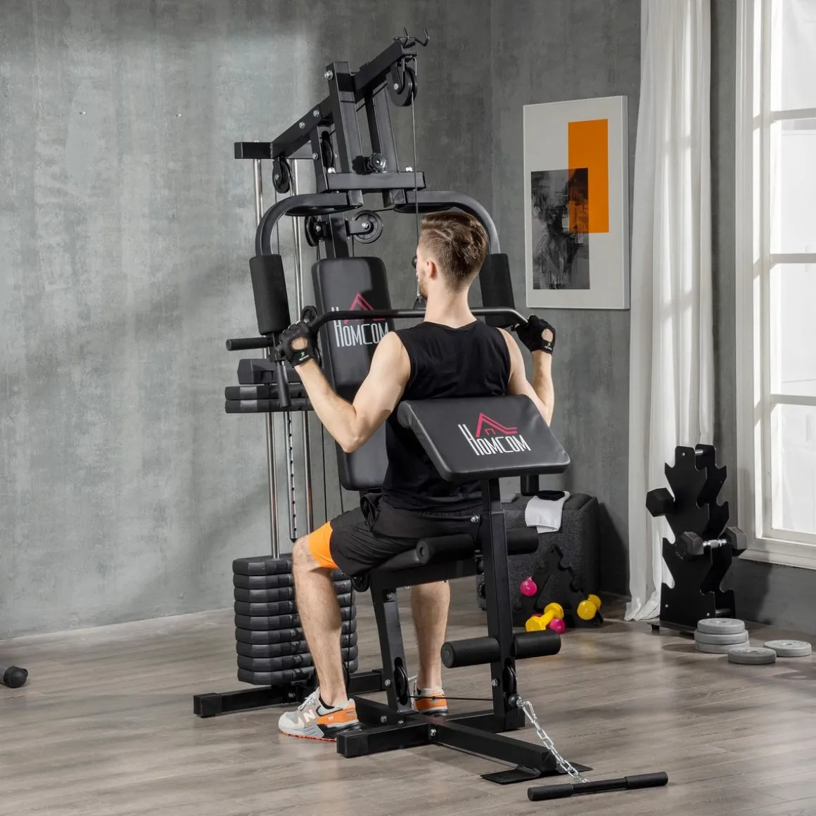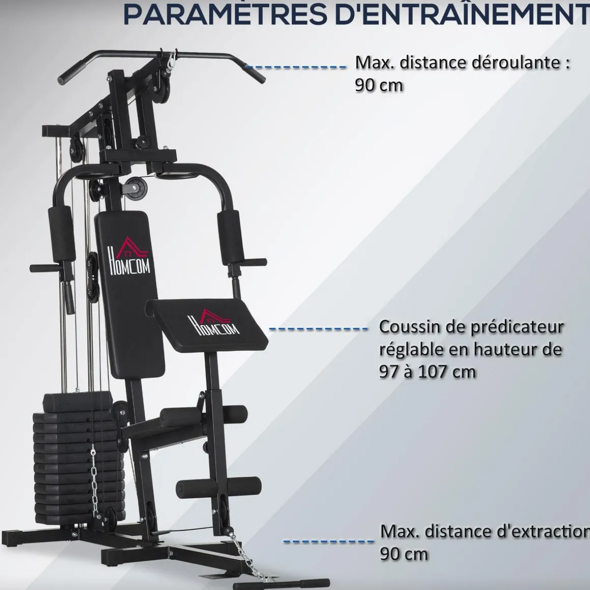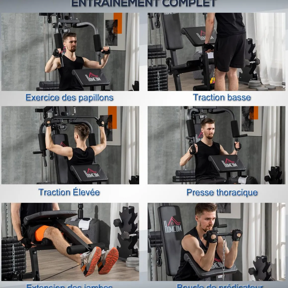 – Nombreux équipements : module développé couché, butterfly, barre latissimus, curler, flexion de jambes, bande de résistance et 11 contrepoids