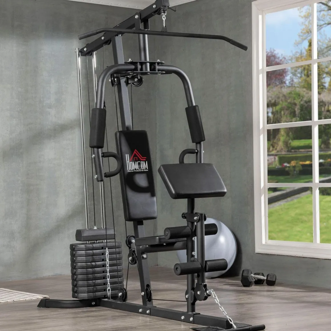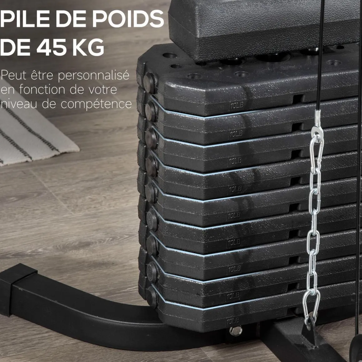 – Nombreux équipements : module développé couché, butterfly, barre latissimus, curler, flexion de jambes, bande de résistance et 9 contrepoids