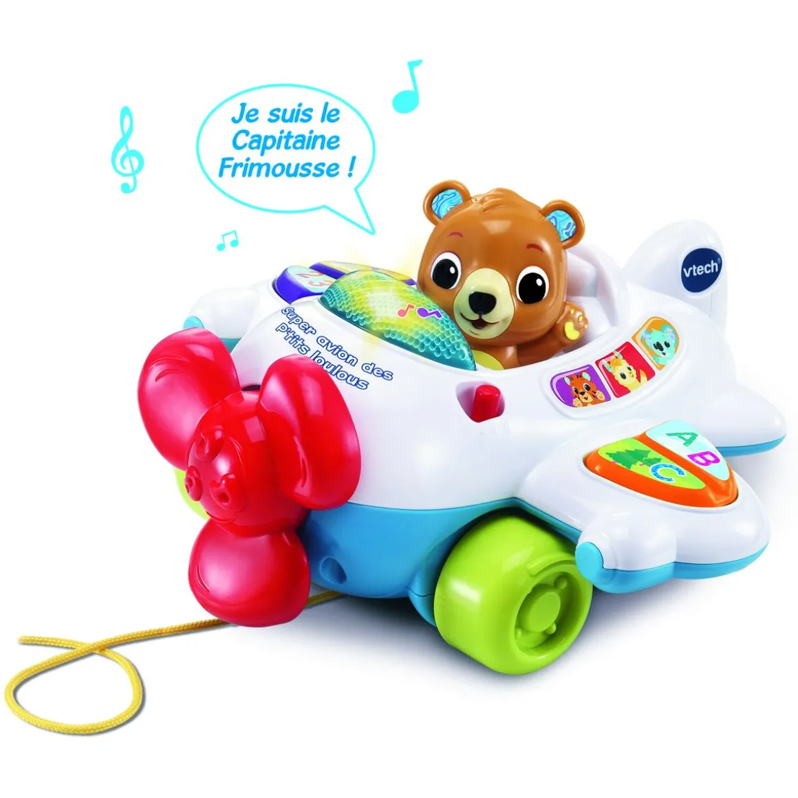 Le personnage de Frimousse l’ours, lorsqu’il est pressé, anime l’avion en déclenchant des phrases et des sons tout en faisant tourner l’hélice. Un détecteur de mouvement enrichit le jeu en émettant des sons et des mélodies lorsque l’avion est poussé ou tiré par sa ficelle. Il est proposé trois chansons et dix mélodies pour stimuler l’éveil des enfants.