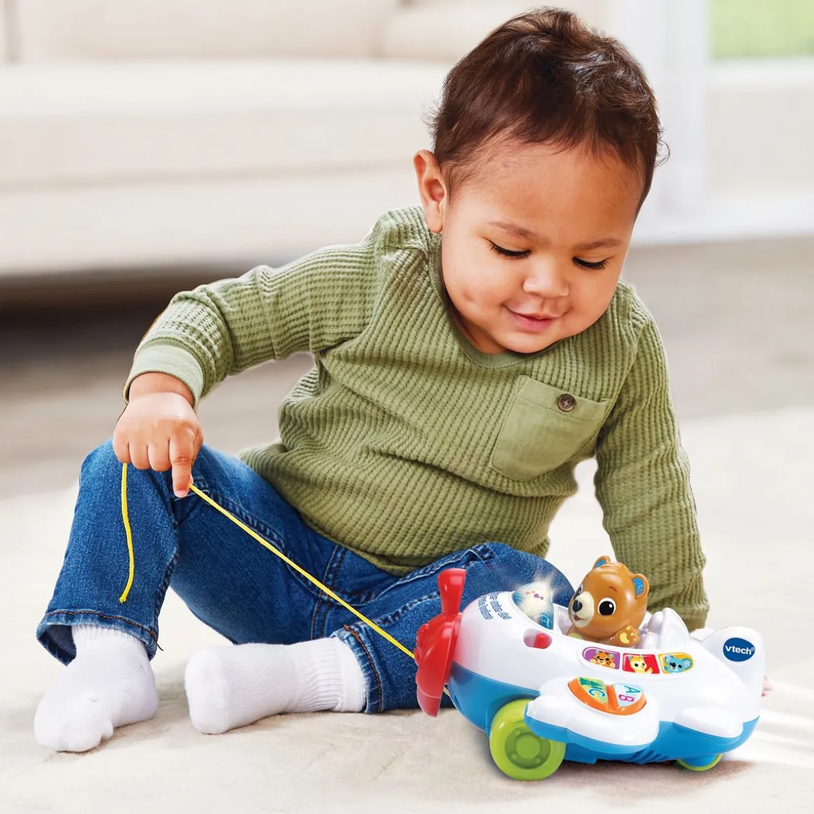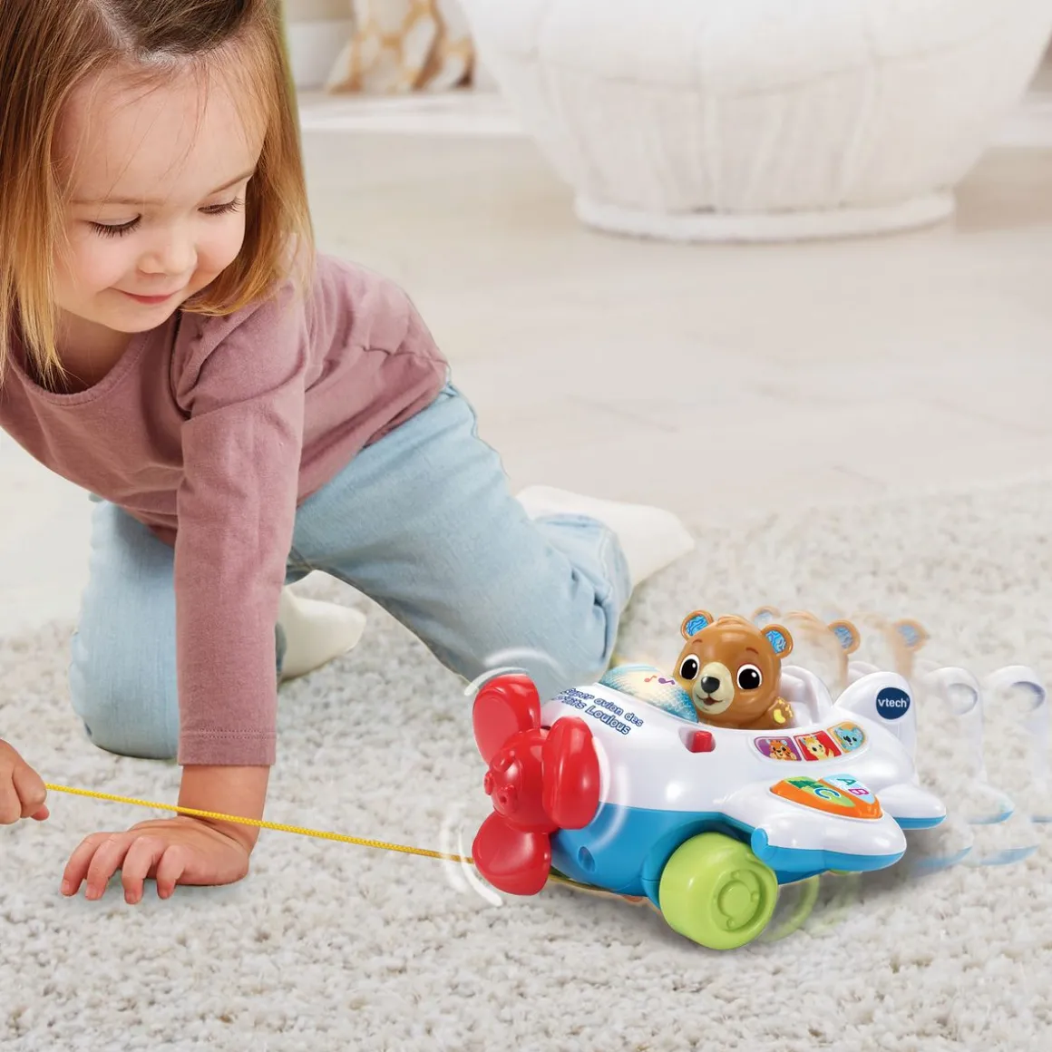 L’avion dispose d’un pare-brise lumineux qui s’illumine pour jouer des chansons et activer des effets lumineux. De plus, deux boutons d’exploration situés sur les ailes invitent les tout-petits à apprendre les chiffres, les lettres, divers objets et à écouter des sons divertissants.